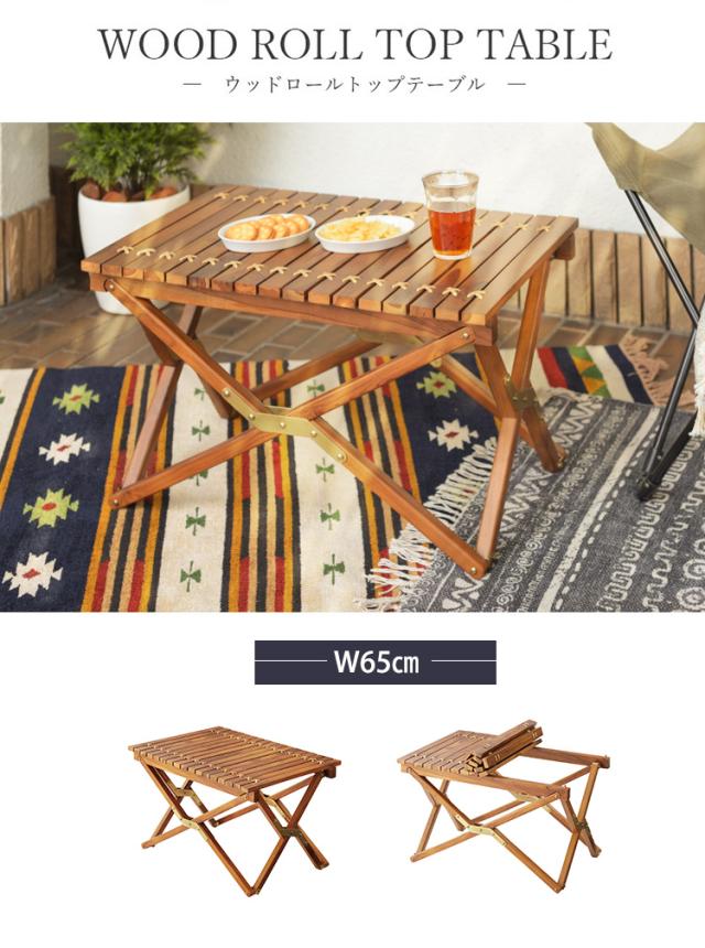 小さく畳める ロール天板 木製 フォールディングテーブル 送料無料 アウトドアテーブル 折りたたみテーブル ガーデンテーブル おしゃれ コンパクト ロータイプ 高さ40cm 幅65 45 キャンプテーブル 屋外 ロール式 持ち運び ローテーブル