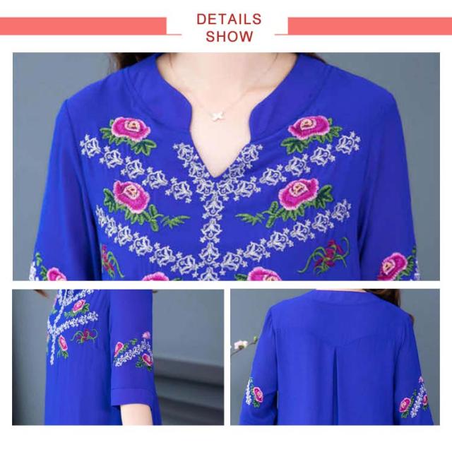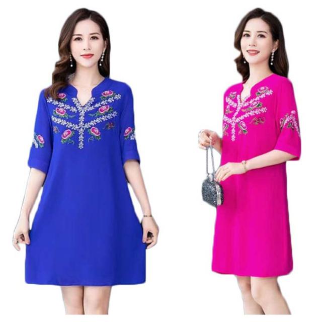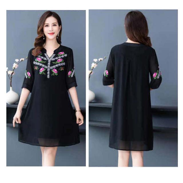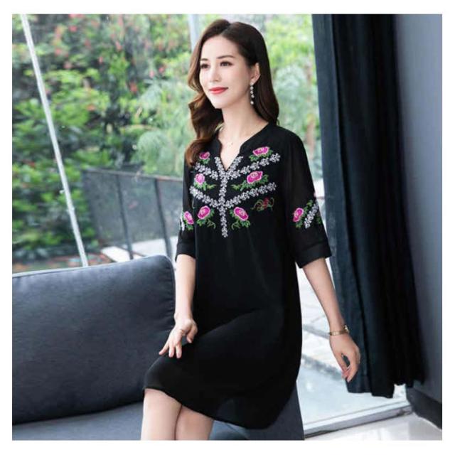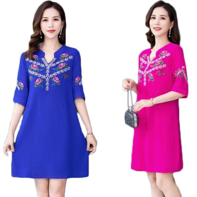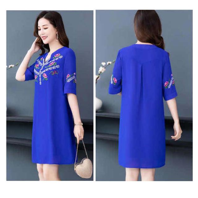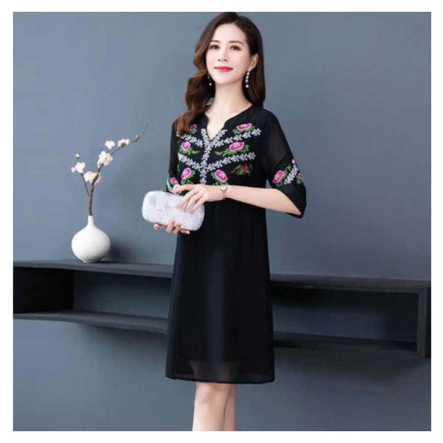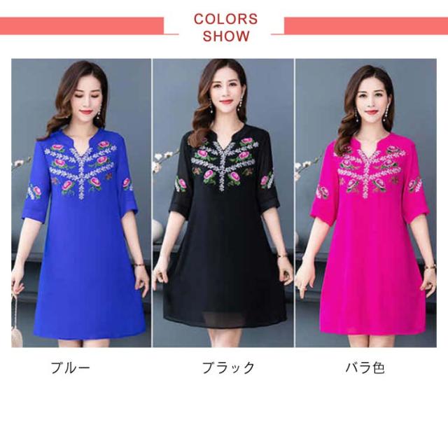 夏 レディース ワンピース 刺繍ワンピース ロングワンピース 大きサイズ ゆったり 無地 5分袖 ロング vネック シフォンワンピース Aライン シンプル カジュアル 送料無料 おしゃれ おでかけ フォーマル