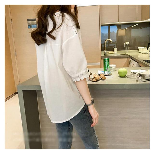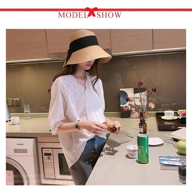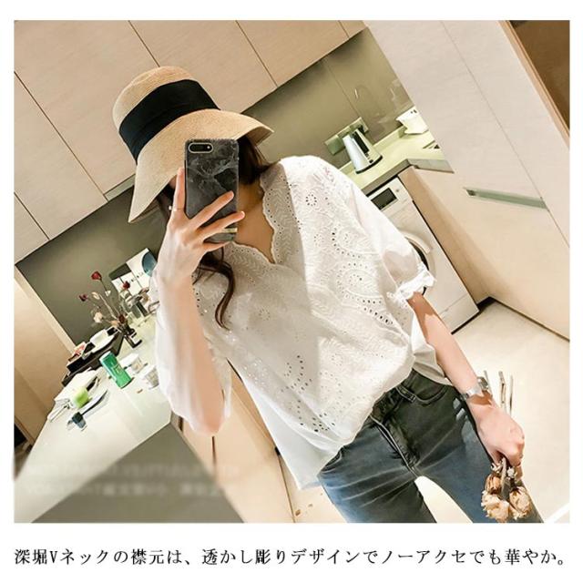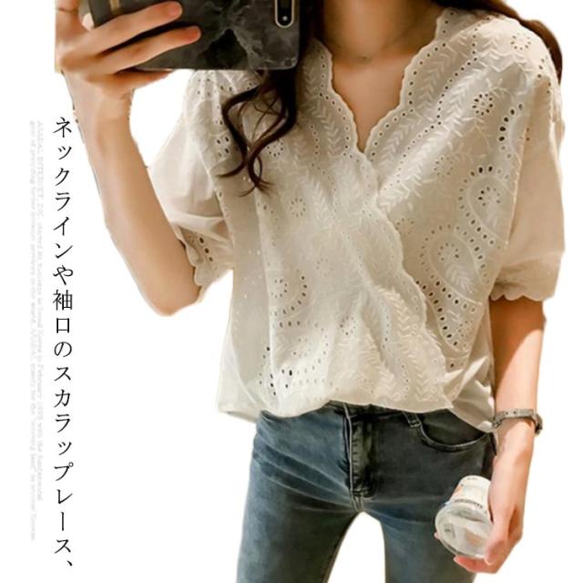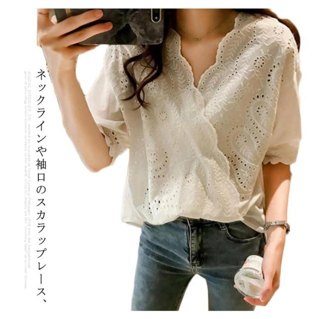 【送料無料】シャツ レディース トップス レディース半袖 シャツブラウス Vネックブラウス レディースファッション スカラップレース パンチングレース フロントギャザー 刺繍 夏 五分袖 おしゃれ 透け感 不規則