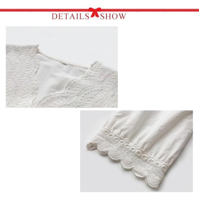 | ネックラインや袖口のスカラップレース、 透け感がある可愛いブラウスです。 深堀Vネックの襟元は、透かし彫りデザインでノーアクセでも華やか。 ふんわりシルエットで体型をカバーし、フロントの裾はギャザーを寄せて、スカートとパンツどれでもよく似合うアイテムです。 | |