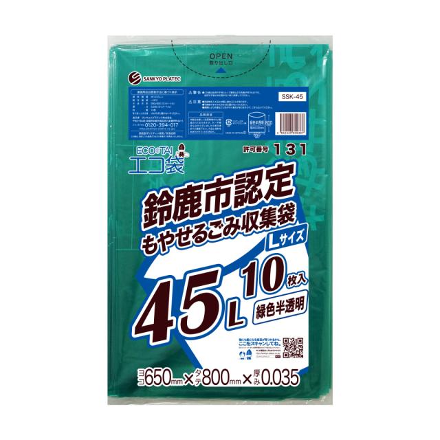 【バラ販売】SSK-45bara 鈴鹿市指定袋 もやせるごみ用 45リットル Lサイズ 0.035mm厚 緑色半透明 10枚/ ゴミ袋 ごみ袋