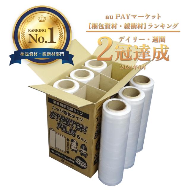 ストレッチフィルム エッジ強化タイプ 450mm幅x600m 0.008mm厚 透明 6本 STR-450-08E /梱包用フィルム 梱包ラップ 大型ラップ 手巻きタイプ