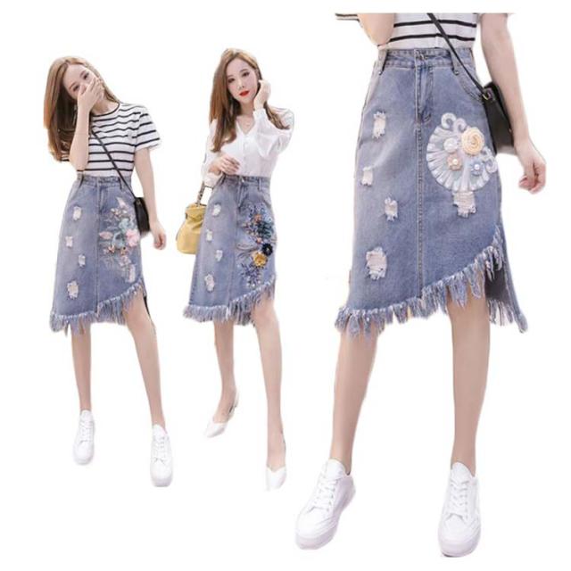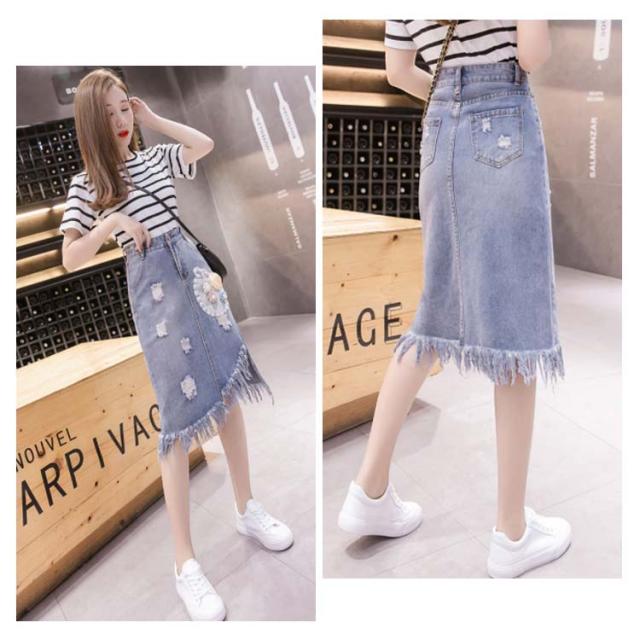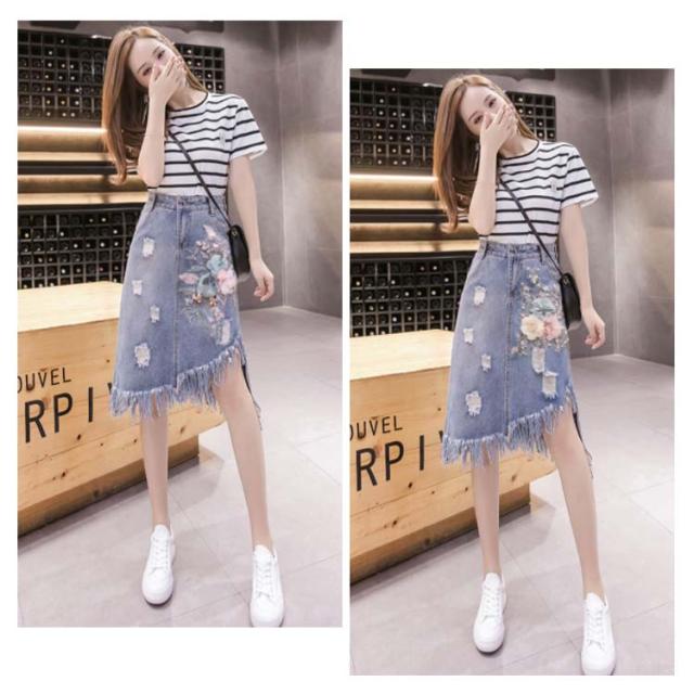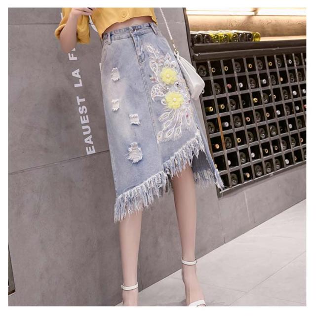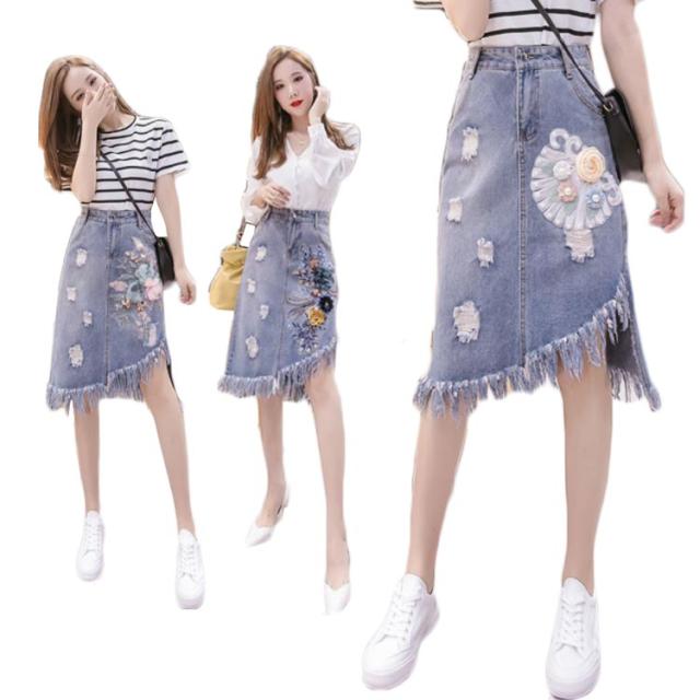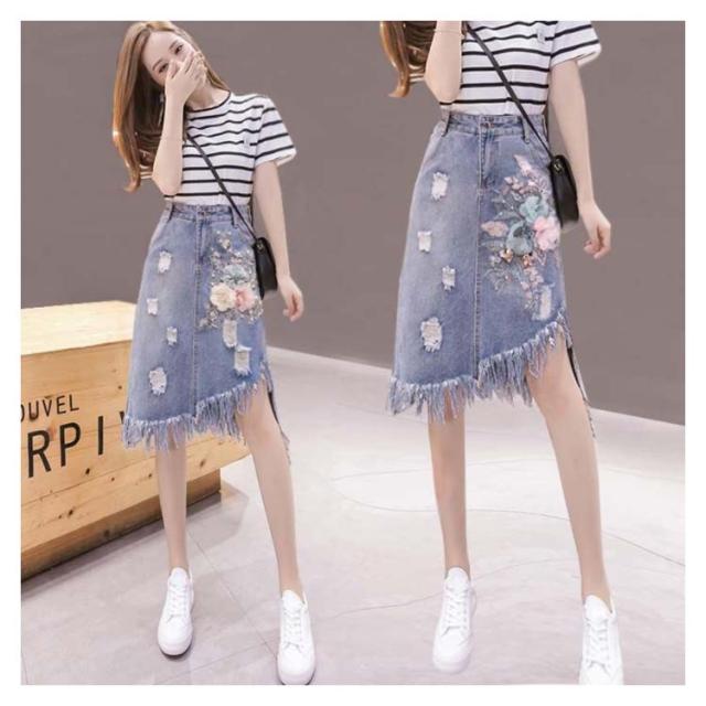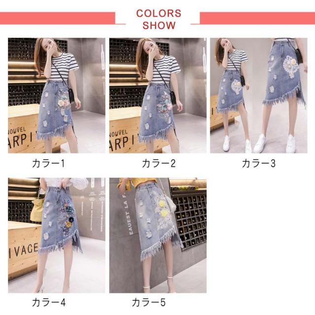 スカート?レディース デニムスカート?ミディアム丈 プリンジ デニム ハイウエスト ダメージ オシャレ 刺繍スカート プリーツスカート ロングスカート?デニム 春 夏?ウエストゴム? Aライン?送料無料
