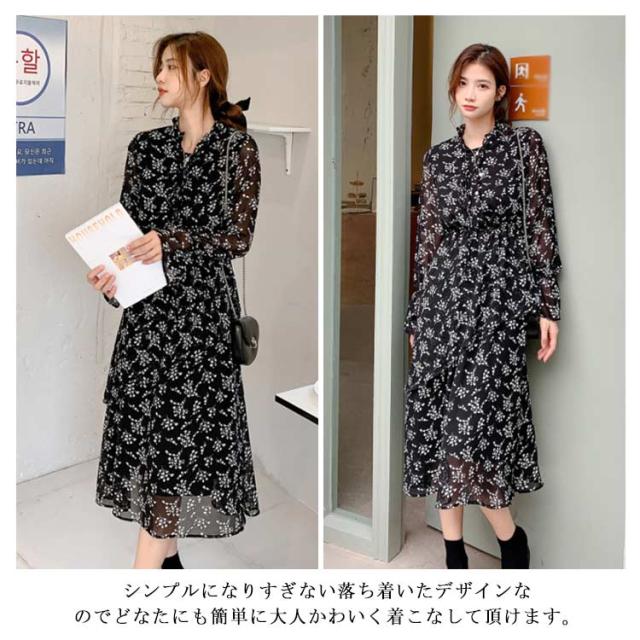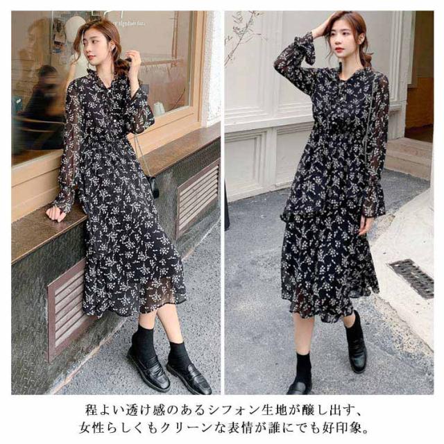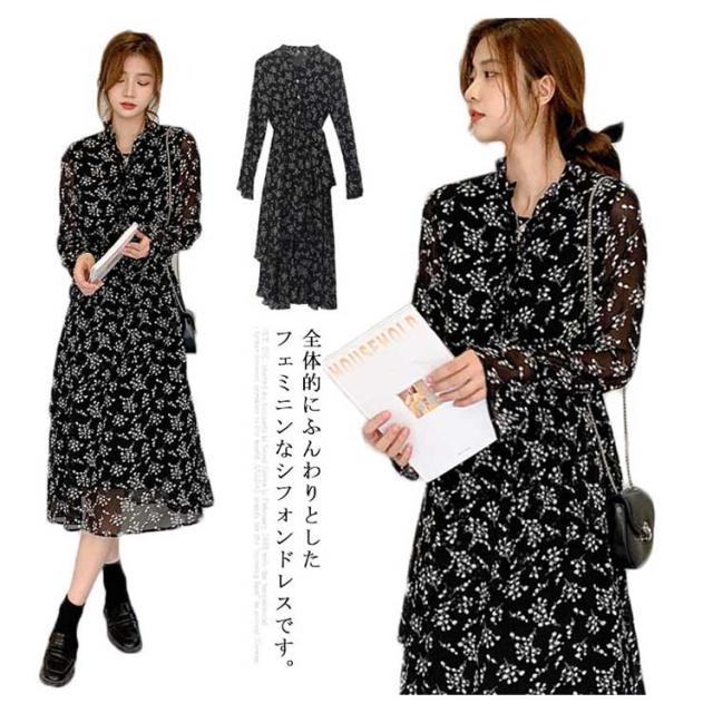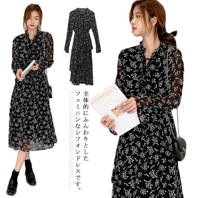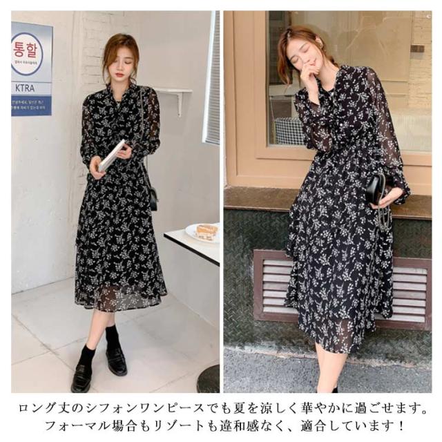 【送料無料】花柄 シフォン ワンピース ロング丈 フェミニン 丸ネック 丸首 薄手 レディース ロング マキシ丈ワンピース 体型カバー 膝下 大きいサイズ きれいめ おしゃれ 裏地付き 透け感