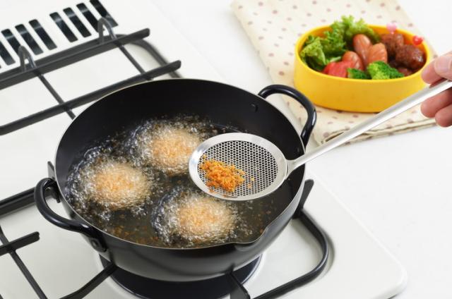 小振りなサイズのかすあげ。細かいメッシュで揚げカスを逃さずすくい上げます。パンチングメッシュで目詰まりしにくく、変形や破れる心配がありません。