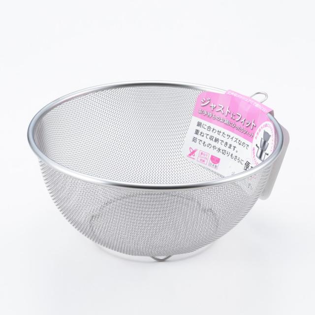 丈夫なメッシュアミで壊れにくい。鍋に合わせたサイズなので、茹でものや水切りもさらに便利。