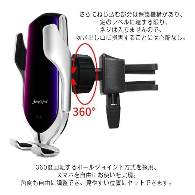| 【安定】普通のクリップとは違い、やっと実現した絶対落ちないホルダー。業界初のフック式クリップを採用し、ホルダーはがっちりと吹き出し口に装着できる。どんな激しい悪路でもホルダーが落ちない!安定性と安全性が共に手に入れる。さらにねじ込む部分は保護機構があり、一定のレベルに達する限り、ネジは入りませんので、吹き出し口に損害することには心配なし。 【片手操作&取り付け簡単】ワンタッチ式で側面に一つのボタンがあり、指一本で押すとわずか0.1秒でアームが自動に開け、運転中にもスマホを片手で取り出せます。装着や、脱着とも簡単です。ホルダー本体の裏側にシリコン製クッションが付き、表面にも炭素繊維があり、傷つけないデザインでスマートフォンにも優しい。 【角度調節自由&充電ながら使用可能】360度回転するボールジョイント方式を採用、スマホを自由にお使いを実現。角度も自由に調整でき、見やすい位置にセットできます。 GPSナビゲーション、天気予報、音楽、交通情報など、スマホの便利な機能をすべて利用できます。また、携帯電話を充電しながら。 【Qi対応】Qi対応の自動開閉ワイヤレス充電ホルダーです。 【高速充電】10W(Android)、7.5W(iPhone)高速充電に対応。 | |
