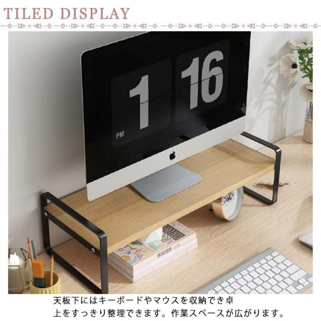 | パソコンのキーボードを収納して広々としたスペースを確保できる机上ラックです。 モニター台を使うことによって、視線が自然に上がり操作がしやすい、背筋が伸びるようになり、猫背を防ぎ、首や肩の負担を軽減することにつながります。 天板下にはキーボードやマウスを収納でき卓上をすっきり整理できます。作業スペースが広がります。 モニターを一段上げることで下のスペースを有効活用でき、デスクをもっと広く使えます。 背面に板などの障害が無いのでケーブル類の配線がスッキリ。 使いやすいシンプルなデザインなので収納ラックやプリンタ台、テレビ台としても。 簡単な組立なので女性でも安心。 | |
