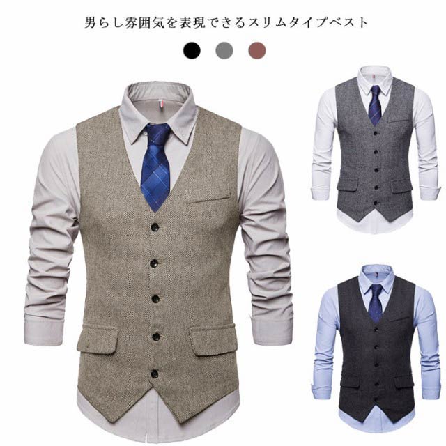 | 男らし雰囲気を表現できるスリムタイプベスト。 体型に沿わせてジャストめで着るのが、カッコよく決めるコツです。 上質感を演出するレイヤードスタイルにぴったりです。 シンプルですっきりとした色展開、ビジネスマンにも重宝します! 結婚式、ビジネスやフォーマルシーンで活躍するおしゃれな一枚。 | |