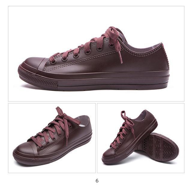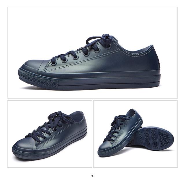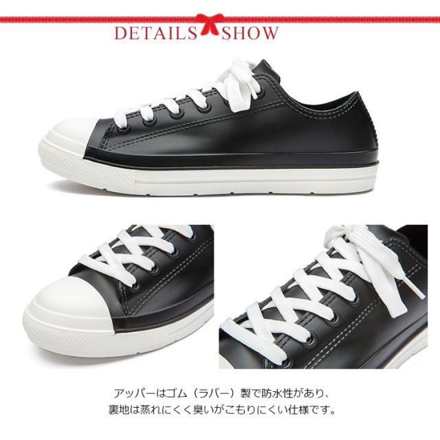 | カジュアルなデザインでスニーカー感覚で履いていただけるおしゃれなレインシューズ。 アッパーはゴム(ラバー)製で防水性があり、裏地は蒸れにくく臭いがこもりにくい仕様です。 アウトソールは凸凹が施されて滑りにくい工夫がされています。 中学生、高校生、大学生の通学、雨の日の自転車通勤、お庭でのバーベキュー、ガーデニングなどの普段使いはもちろん、海や川でのレジャーにも大活躍間違いナシ。 | |