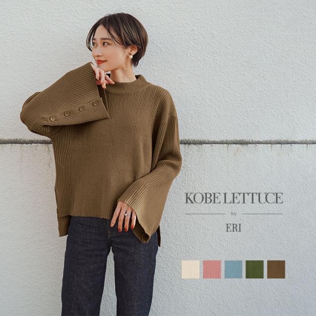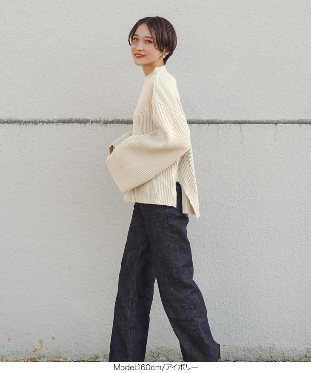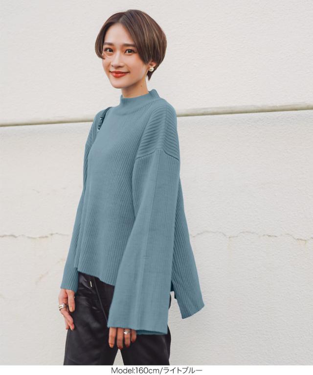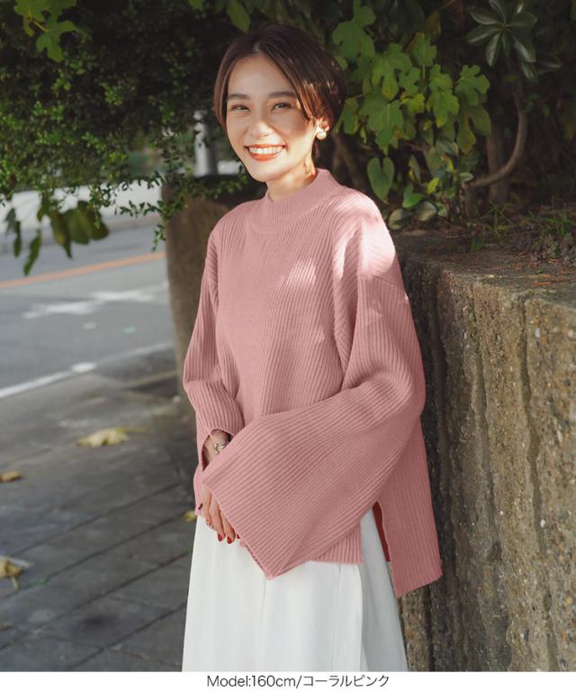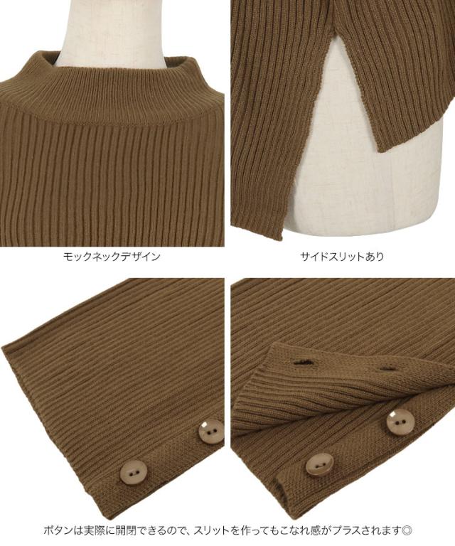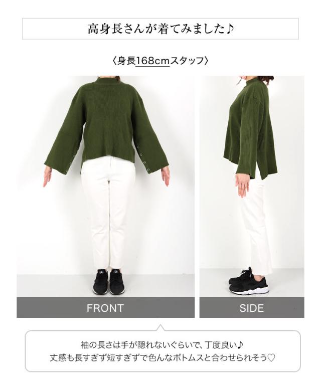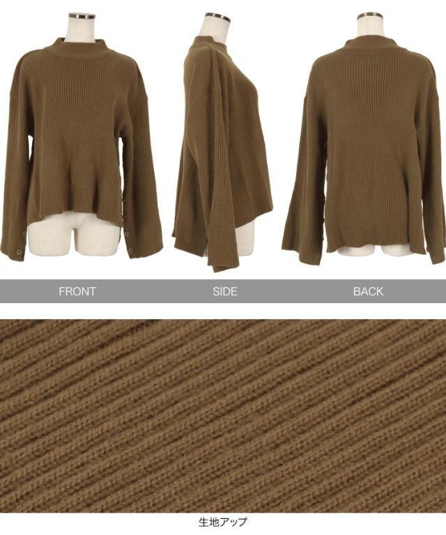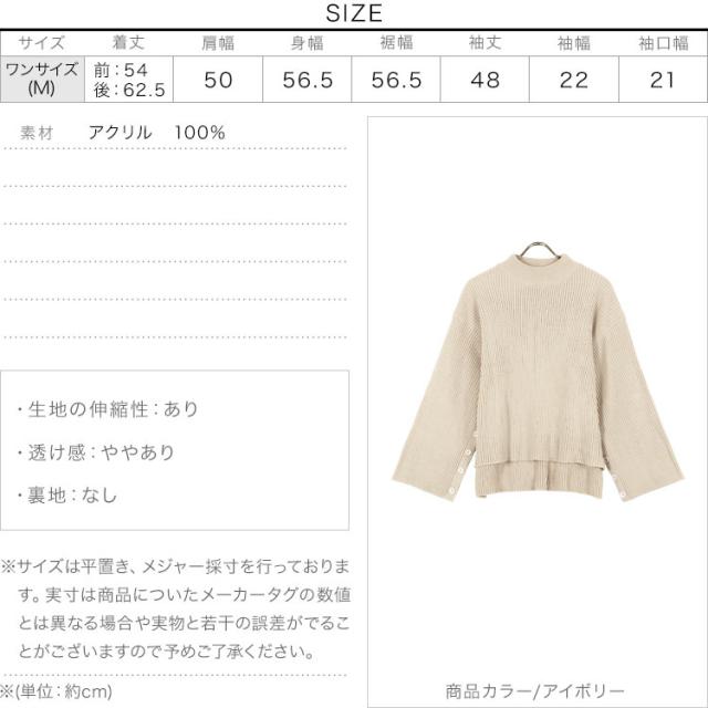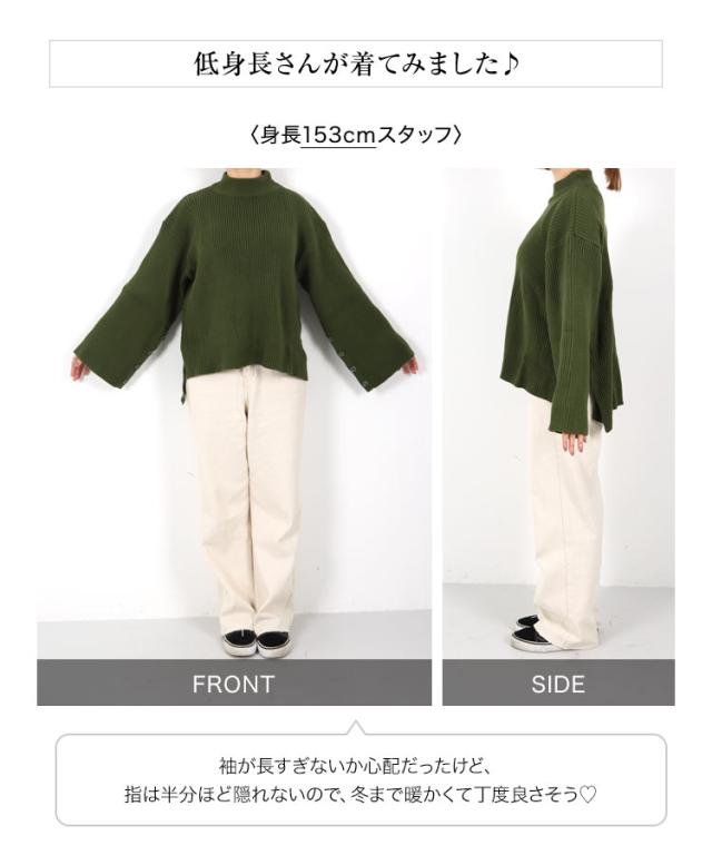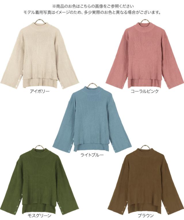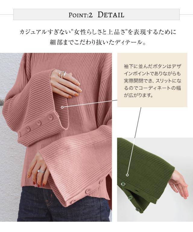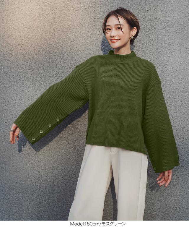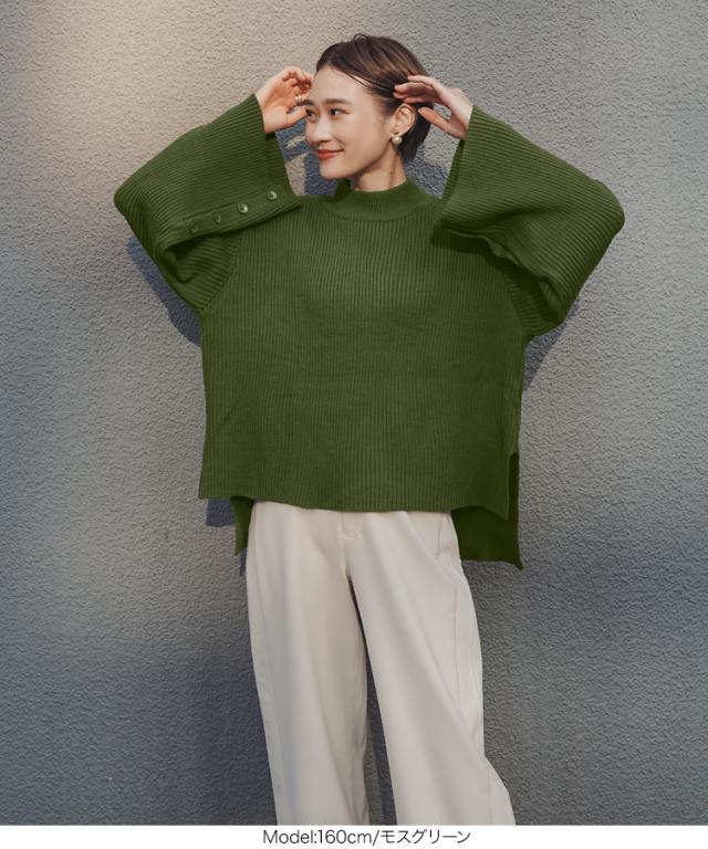春新作 [ eriさんコラボ ] ボタンデザインモックネックニットトップス C5786 入荷済 レディース 長袖 ワイドスリーブ ゆったり スリット プルオーバー セーター フレアスリーブ 体型カバー きれいめ カジュアル 大人 大人カジュアル 大人可愛い 40代 50代