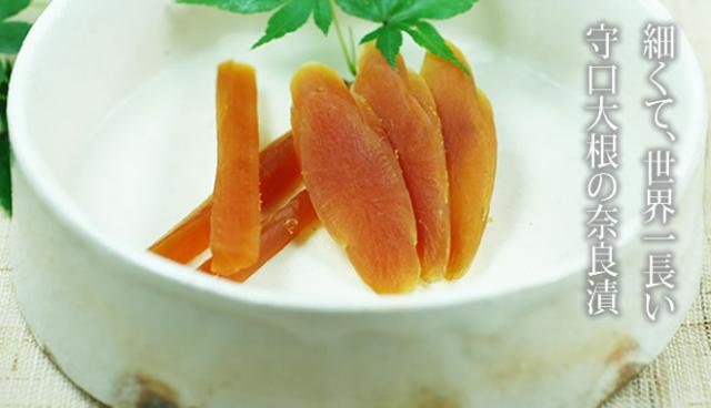豊臣秀吉が大阪府守口市付近で献上され気に入ったので守口漬と言われるようになったとか。今や愛知県の特産品として有名に。世界一長い大根と言われ一見ごぼうとみまちがいますが、収穫したて色白でまさに大根。薄切りにしてもポリポリと小気味良い歯ごたえがあり大変人気があります。