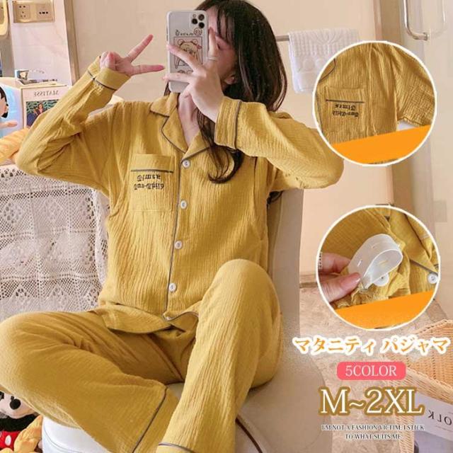 マタニティ パジャマ 前開き 長袖 授乳口付き セットアップ ルームウェア ウエスト調整付き パジャマ 上下セット 可愛い 新作 5色