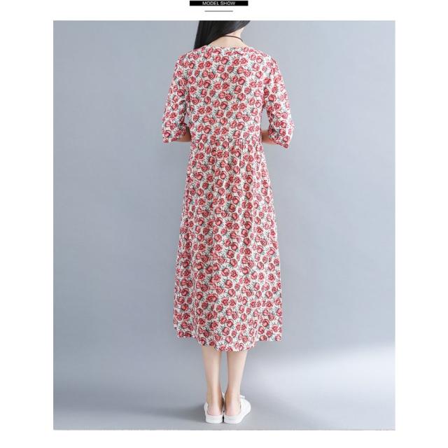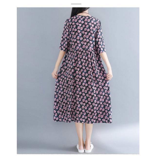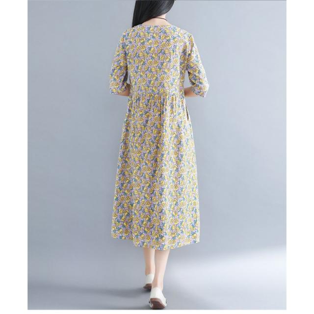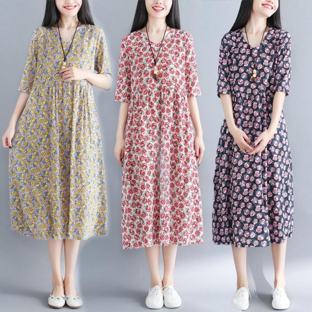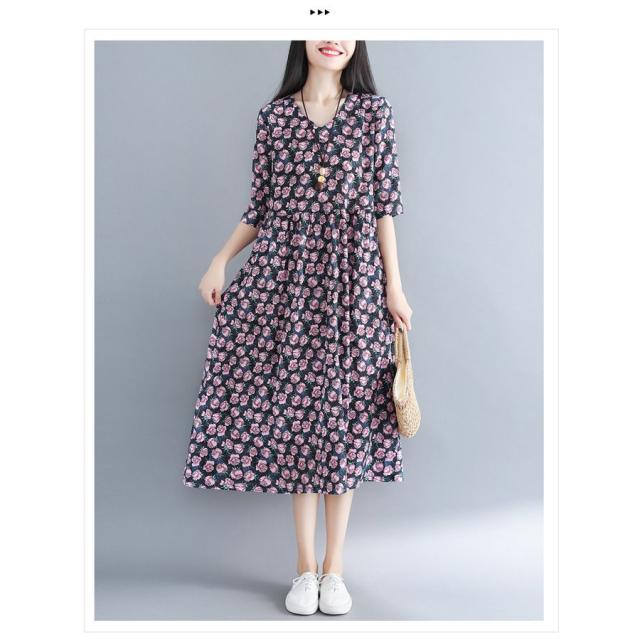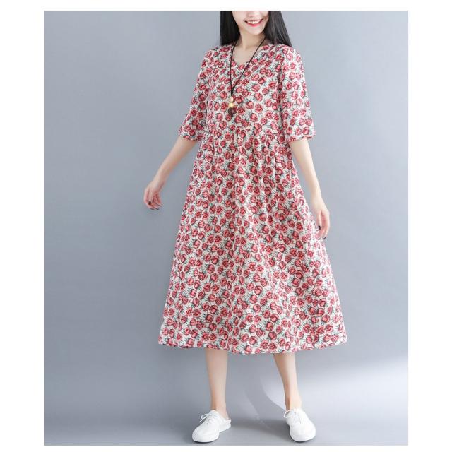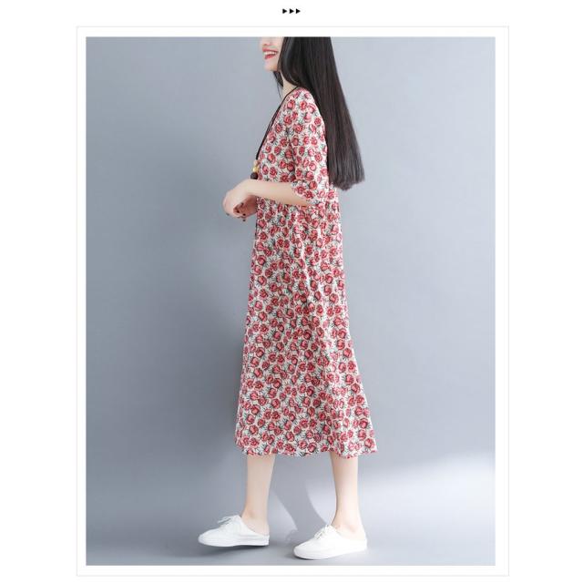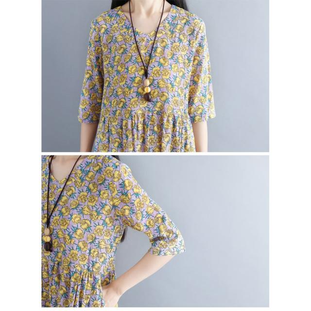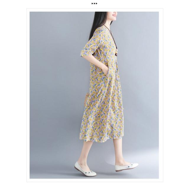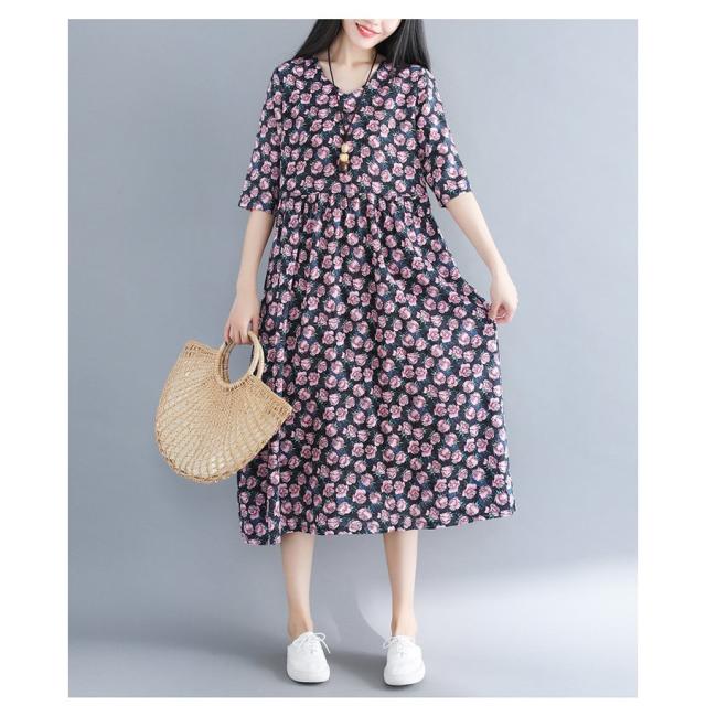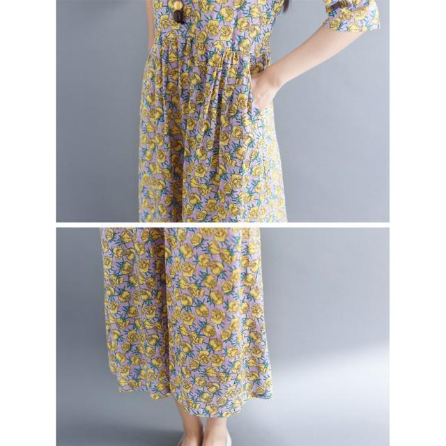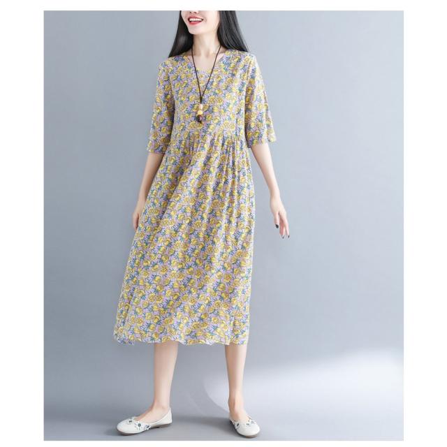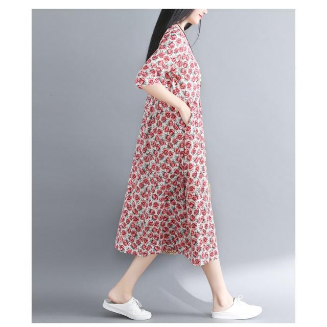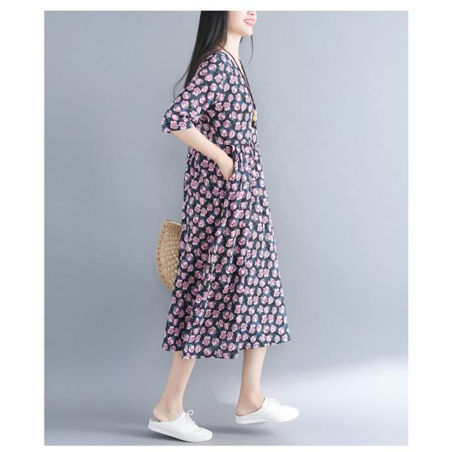 マキシワンピース綿麻混Vネック半袖 ワンピース花柄レディースロングシャツ春 秋春コーデ 通勤秋ワンピゆったり ワンピース 体型カバーお出かけ