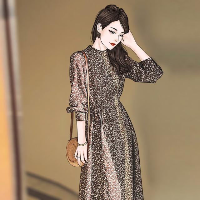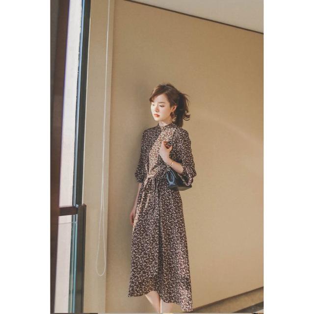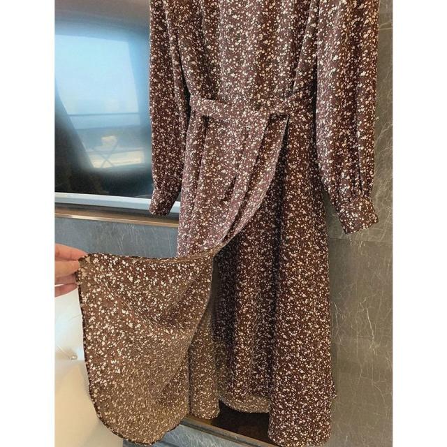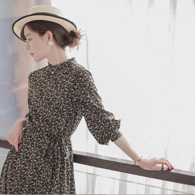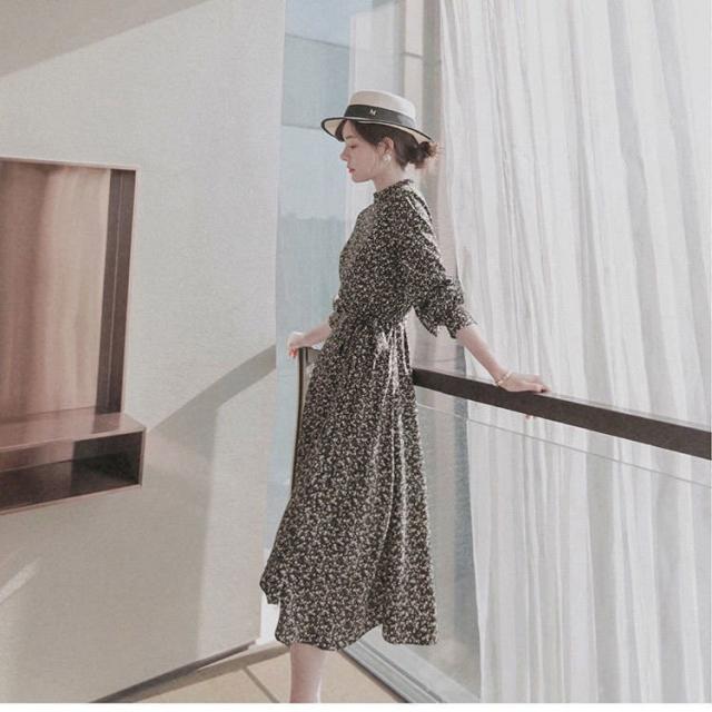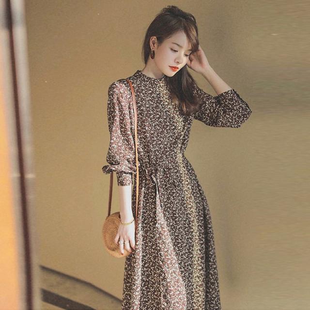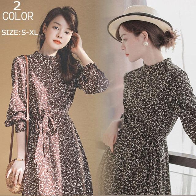 ロングワンピース レディース 長袖 花柄 フリル 立ち襟きれいめ ボウタイaラインおしゃれ大人OLシフォンワンピース2021春秋春コーデワンピース