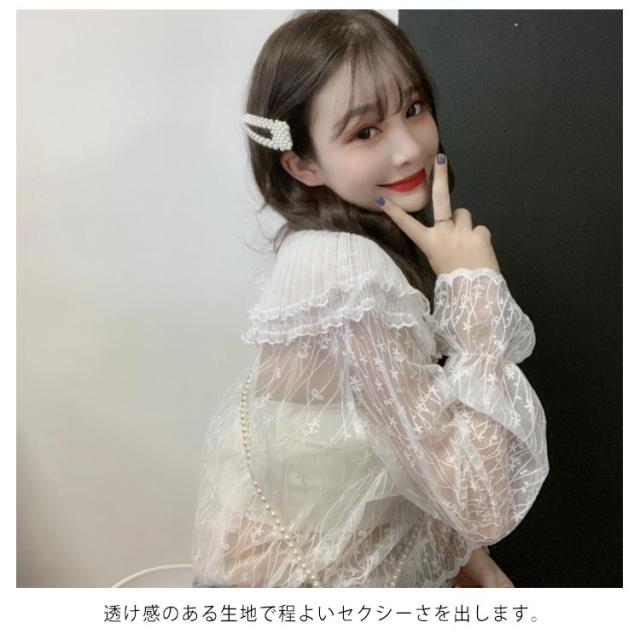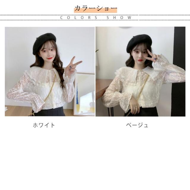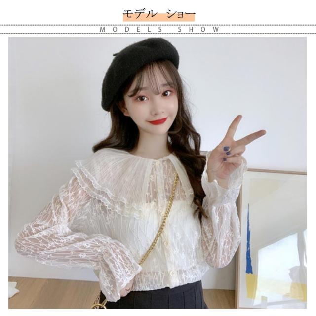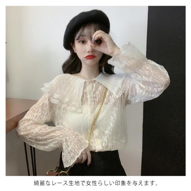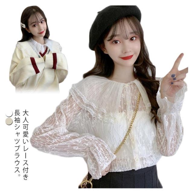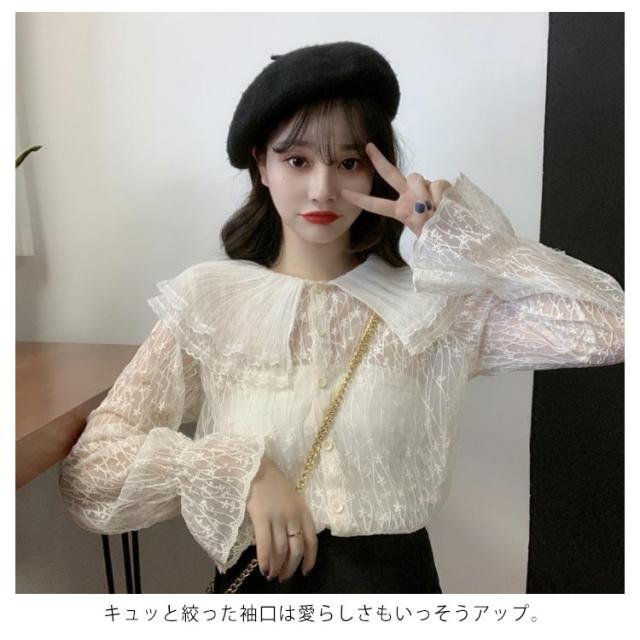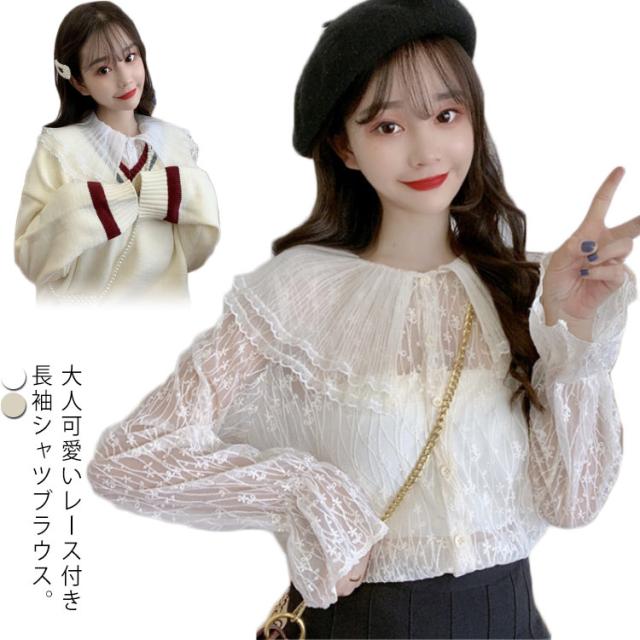 送料無料 レースブラウス レディース ブラウス 長袖ブラウス 総レースブラウス 透けブラウス レース 花柄レース 折り襟 二重襟 フリル チュール 透け感 重ね着 エレガント 優雅 お嬢様風 華やか カジュアル トップス 春新作