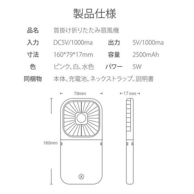 | サイズについての説明 | 真夏の猛暑 暑さ 対策 清涼 グッズ !気軽に持ち歩きが可能♪【3段階の風力調節が可能】・簡単操作!ボタン1つで微風・涼風・強風の3つの切り替えが可能♪ 7枚の羽根が生み出すパワーの涼しさは間違いなし!【2020年最新版モバイルバッテリー付き扇風機】・3.5時間フル充電で弱運転なら最大12時間使用可能 2500mAhの大容量バッテリー搭載のため、お出かけ時や充電ができない場所でも安心です。【軽量・薄型のコンパクト設計】・アームを折りたためば大きさはA5ノートより小さなサイズ! 携帯性に優れているのでカバンに入れて持ち運びがしやすいというのも大きな特徴です。【PSE認証済み】・安心あんぜんのPSE認証取得済みモバイルバッテリー 品質に自信があるからこその90日品質保証付き!【パッケージ情報】・モバイルバッテリー付き扇風機本体 ・ネックストラップ ・Micro USBケーブル・取扱説明書【商品情報】・サイズ 160×79×22mm(縦×横×幅)・重量 115g・バッテリー容量 2500mAh・充電時間 約4時間・稼働時間 約4〜10時間 |