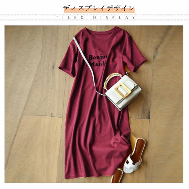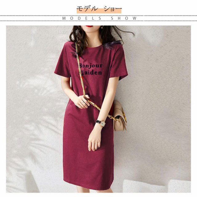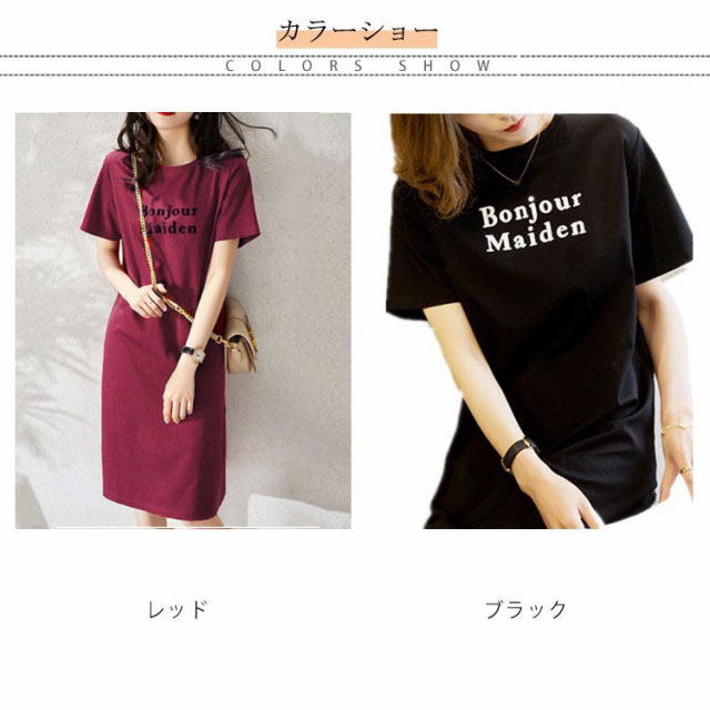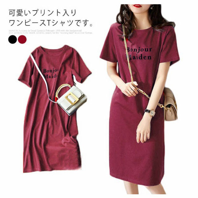 送料無料 Tシャツ レディース ワンピース トップス 半袖 ロンT ロングTシャツ ティーシャツ 半袖tシャツ カットソー インナー ルームウェア ゆったり ミディアム 膝丈 大きいサイズ プリント シンプル 可愛い