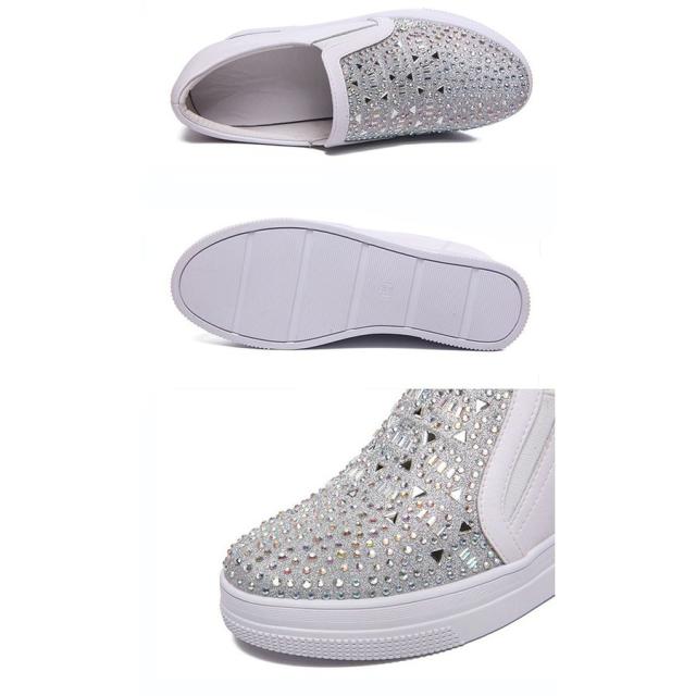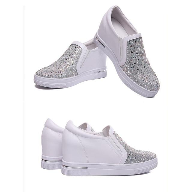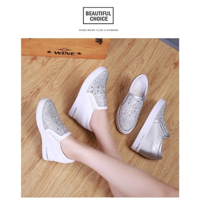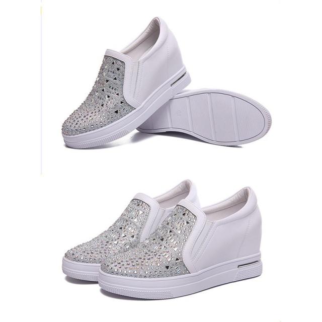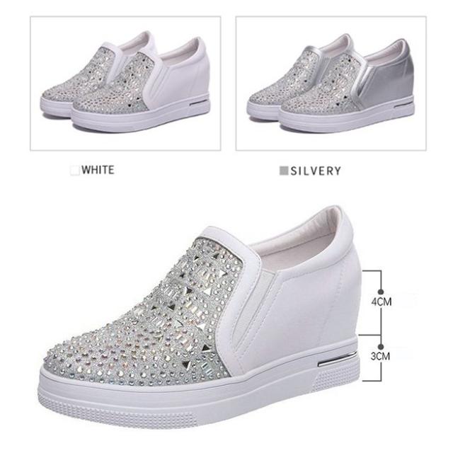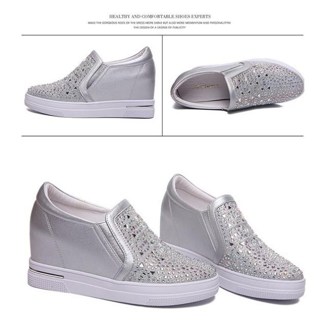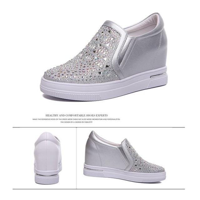 【22.0~25.5】インヒールスニーカー ヒール7cm キラキラ スリッポン ゴムソール 厚底 ローカット ローファー レディース 白 シルバー