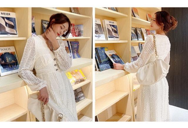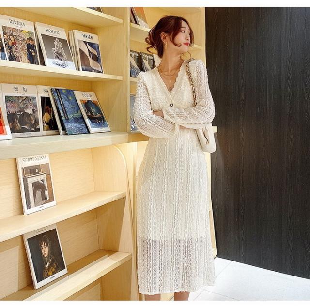 レースワンピース レディース 40代マキシワンピース 春秋 長袖ワンピース vネック ワンピース Aラインスカート オシャレ 通勤 結婚式 お出かけ 大人 30代 50代
