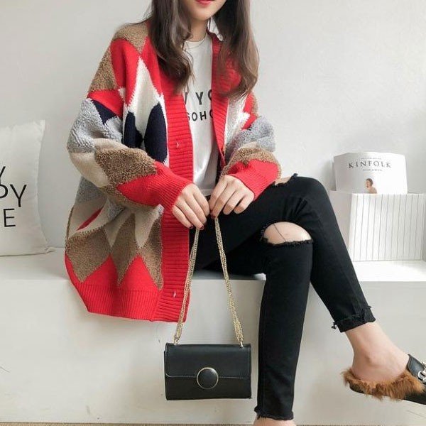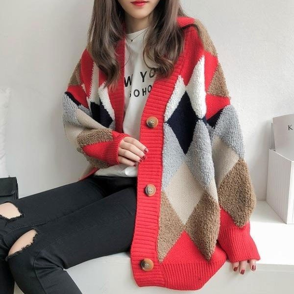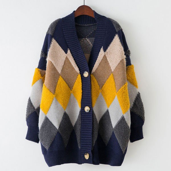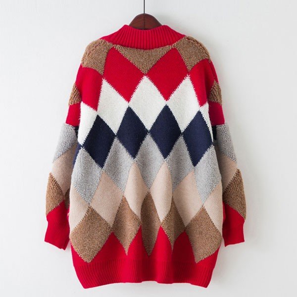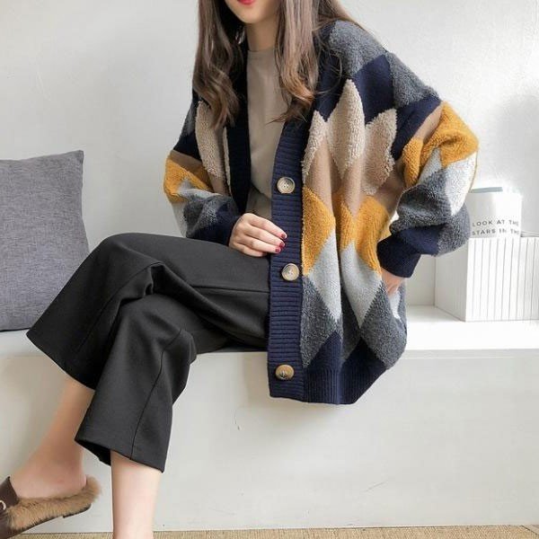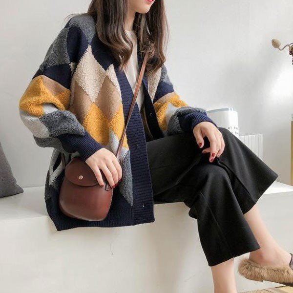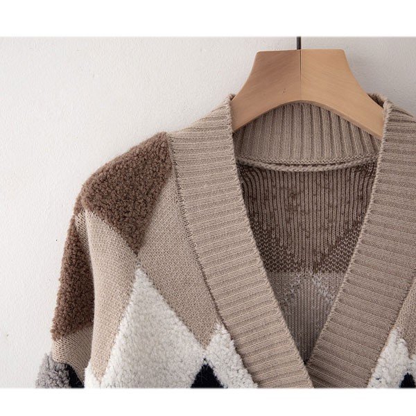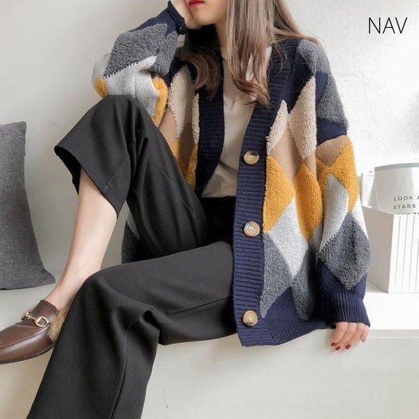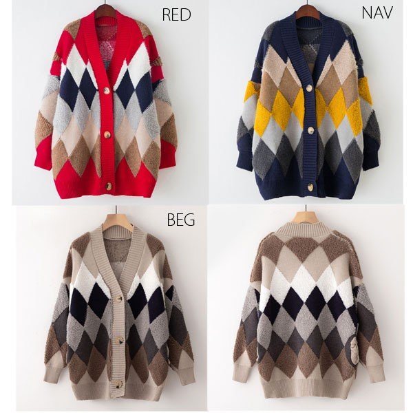 カーデ レディース トップス アーガイル柄 ニット カーディガン アーガイル もこもこ 2019 秋 冬 セール