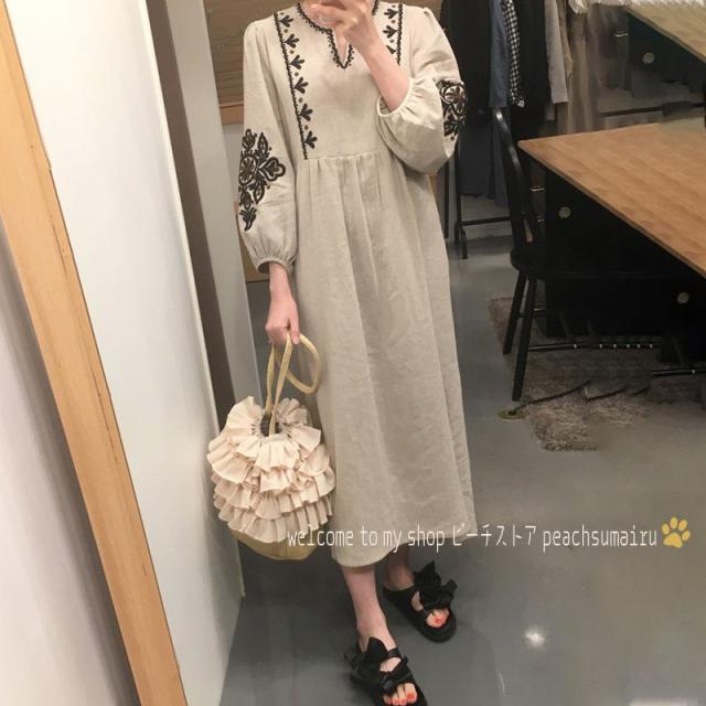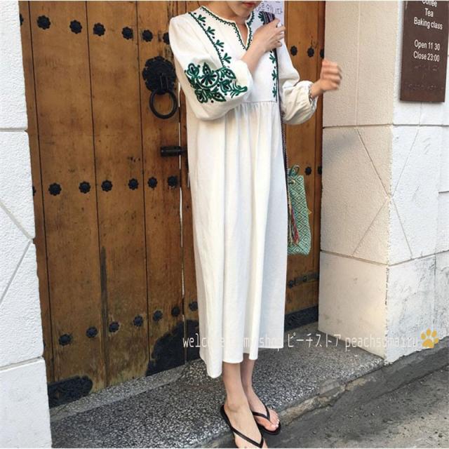 ワンピース レディース 40代 マキシワンピース 春夏 長袖ワンピース きれいめ 刺繍Vネックワンピース パフスリーブ オシャレエスニック 大人 30代 50代
