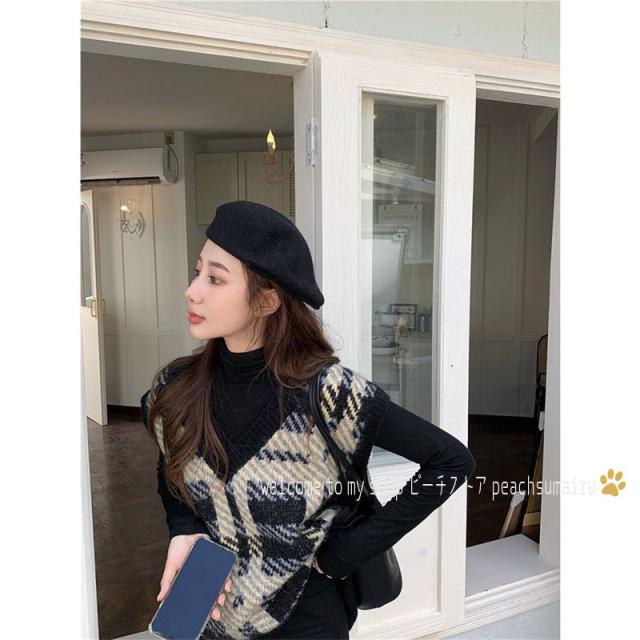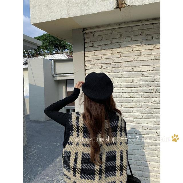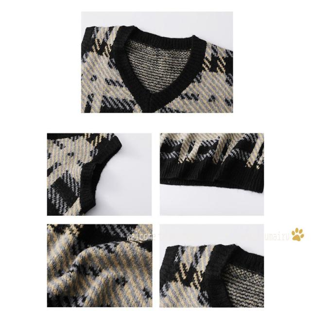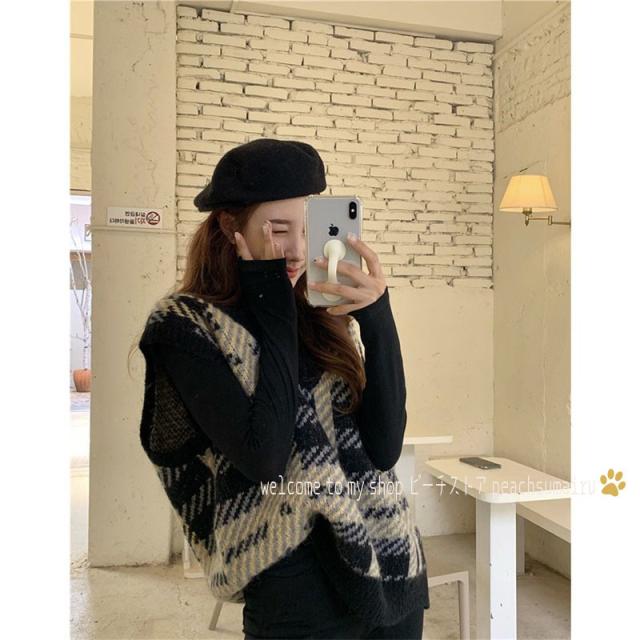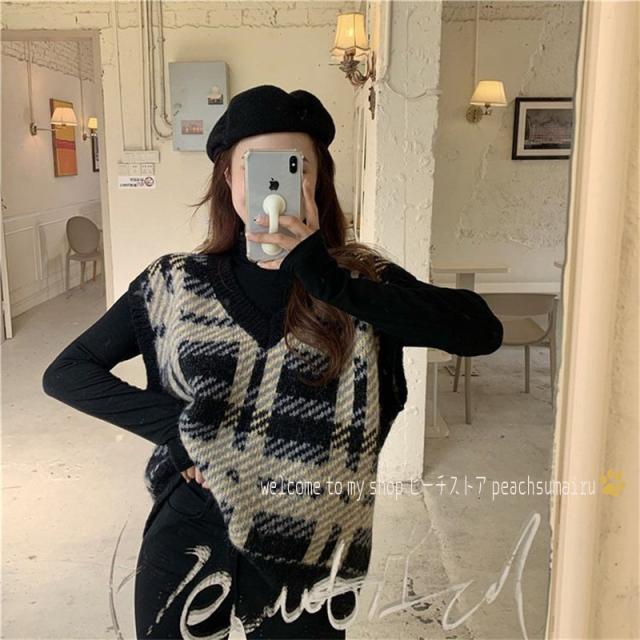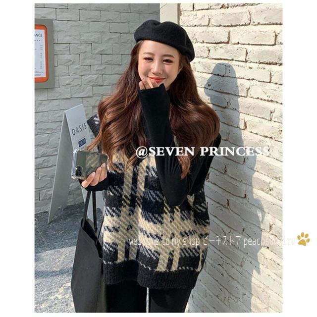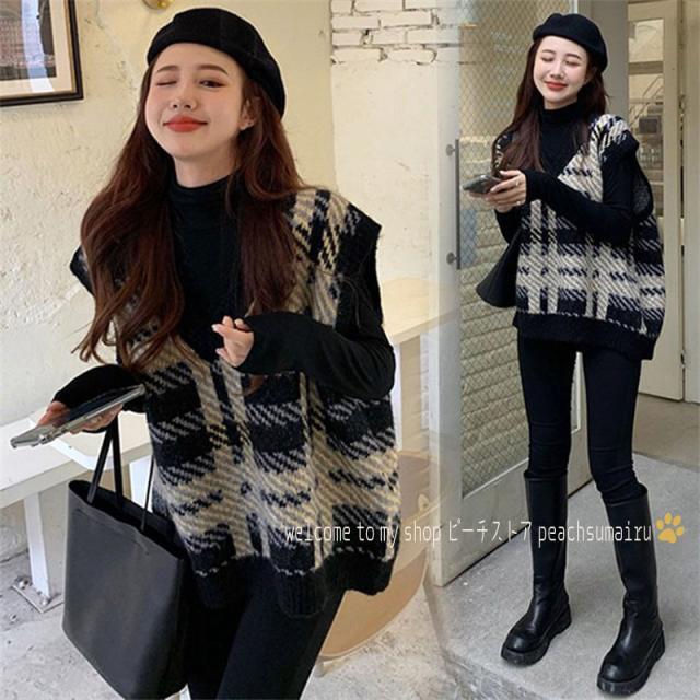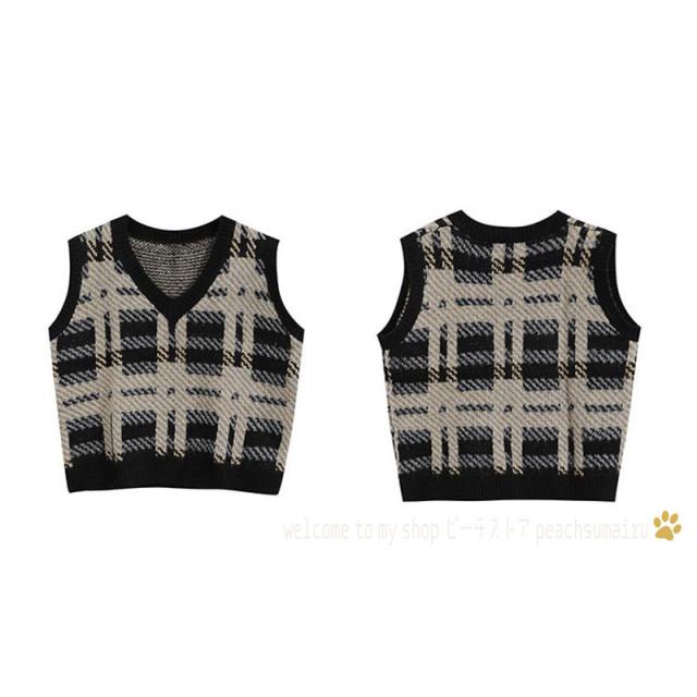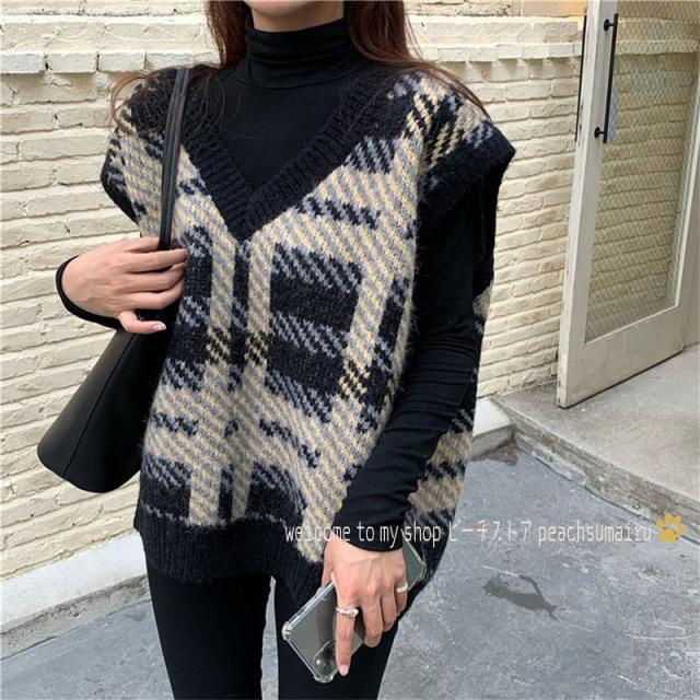 ニットベスト レディース 40代 春秋冬 ベストセーター ノースリープ チェック柄 Vネックニットベスト カジュアル韓国風 ゆったり 通勤 着痩せ 体型カバー 秋服