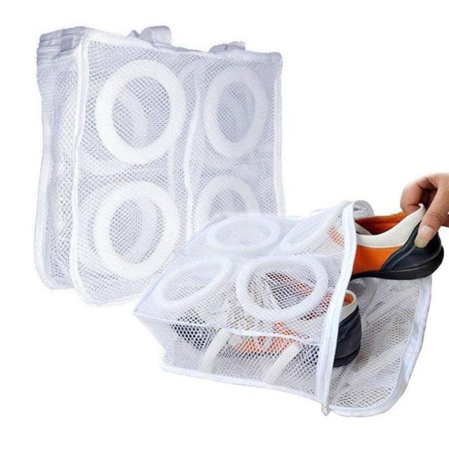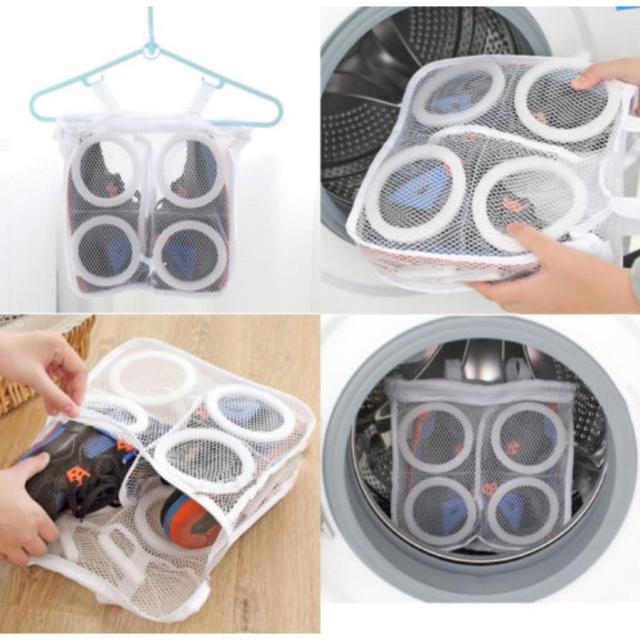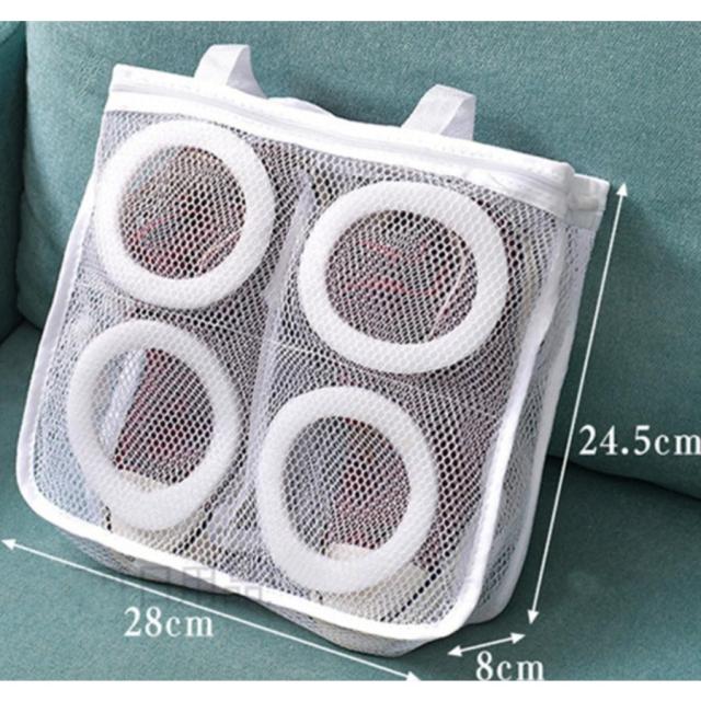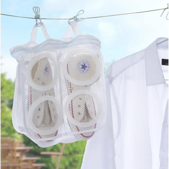 | サイズについての説明 | 洗濯機に入れて、そのままネットごと干せる便利なシューズ洗濯ネットです! 普段あまり洗えないスニーカーなどの靴もこれをつかって簡単に洗うことができます◎ 収納スペースが左右に分かれているので靴同士がぶつかり合うことなく洗浄できます。 汚れが激しい場合は、ブラシで洗ってからの洗浄をオススメします。 材質:ポリエステル 丈夫で水切りの良いメッシュ生地 サイズ:28*24.5*8cm |