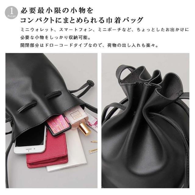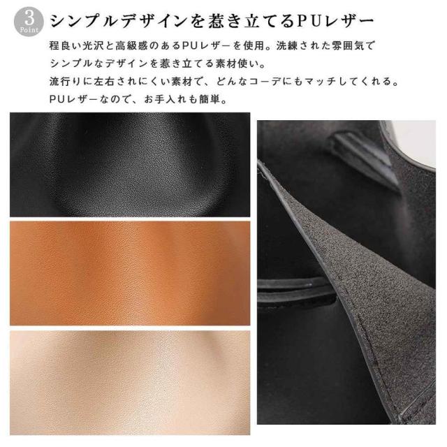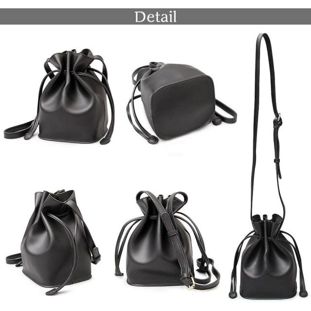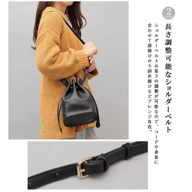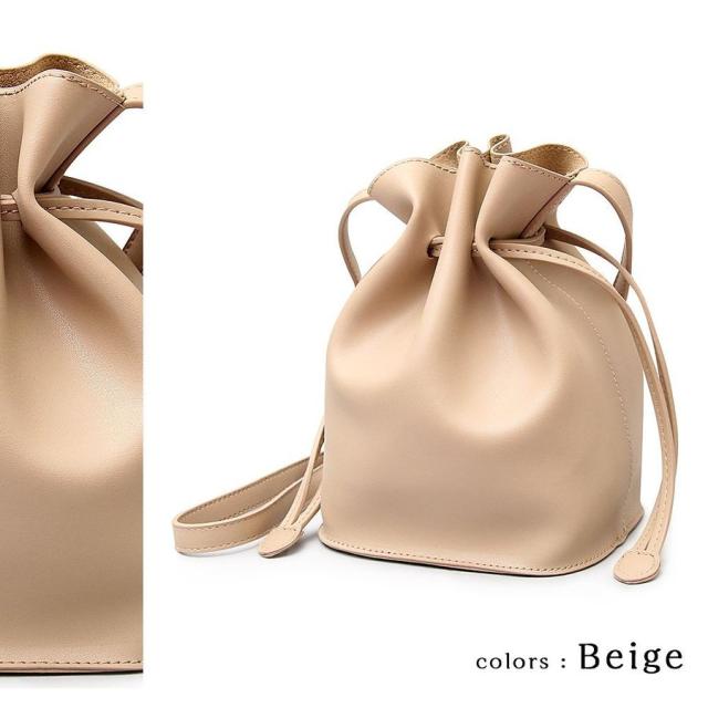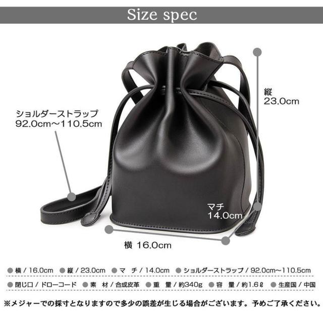 | サイズについての説明 | ラフなのにおしゃれなPUレザー巾着バッグシンプルなデザインでスタイリングを選ばず、持つだけでさりげなくトレンド感を出してくれる巾着バッグ。本革と比べ軽く、お手入れの手間も少ない気軽な使い心地が魅力のPUレザーを使用。かわいくなりすぎず、いつものコーデに合わせやすい素材使い。柔らかく、手触りが良いのも魅力の1つ。ショルダーベルトは、バックルがついているので好みの長さに調整可能。カラーは、どんなファッションにも合わせやすいブラック、女性らしく、程よい抜け感をプラスできるベージュ、温かみを感じるキャメルの3色展開。必要最小限の物をオシャレに持ち歩くための必須アイテム。【発送方法】ヤマト便 / 送料無料 |