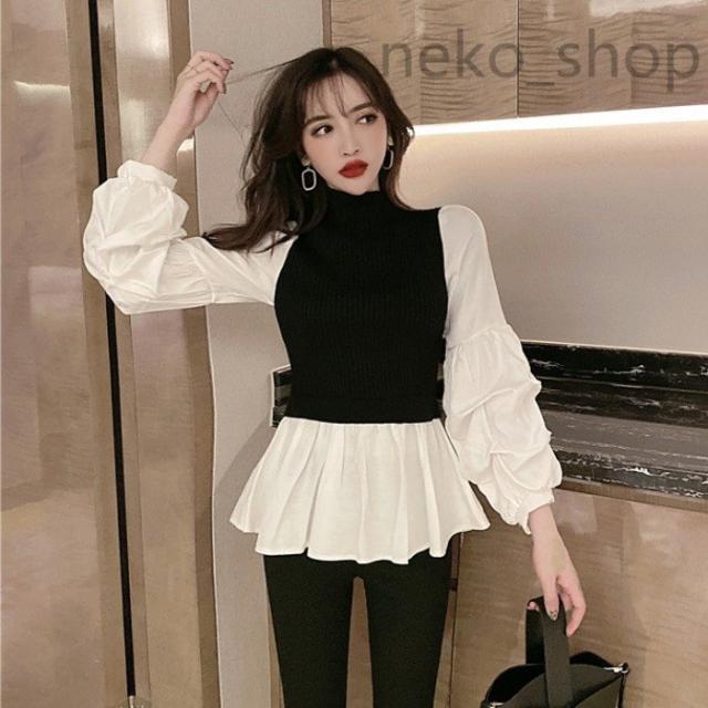 フェイクレイヤード タートルネック ニットトップス レディース 長袖 ブラウス シャツ ドルマンスリーブ セクシー かっこいい 女性用 30代40代 秋冬
