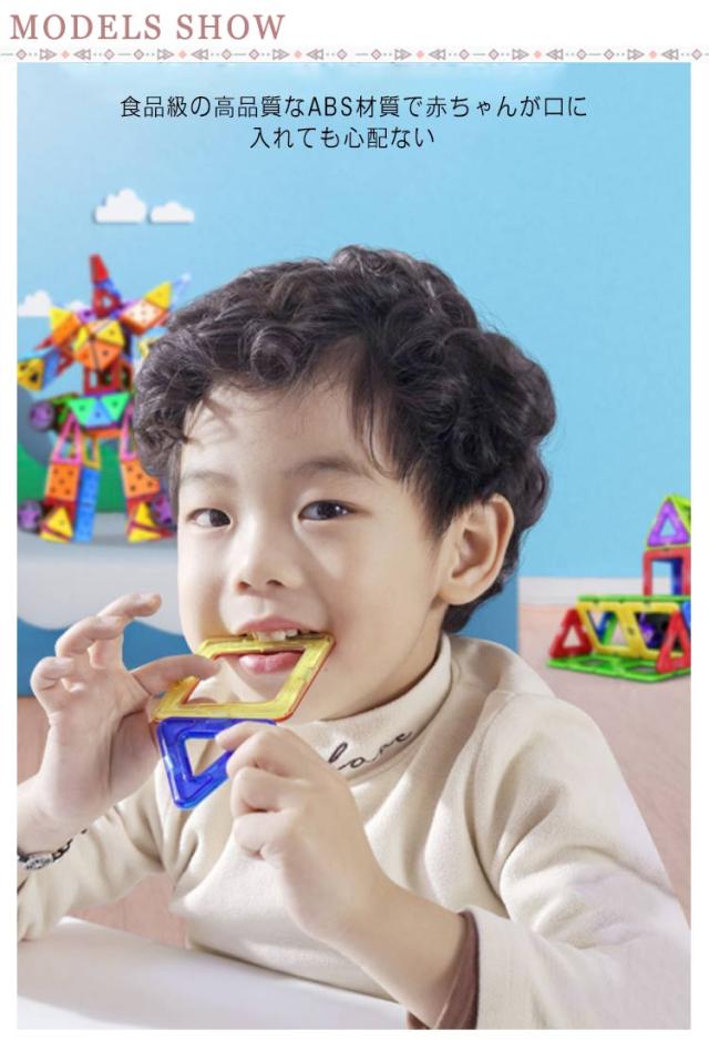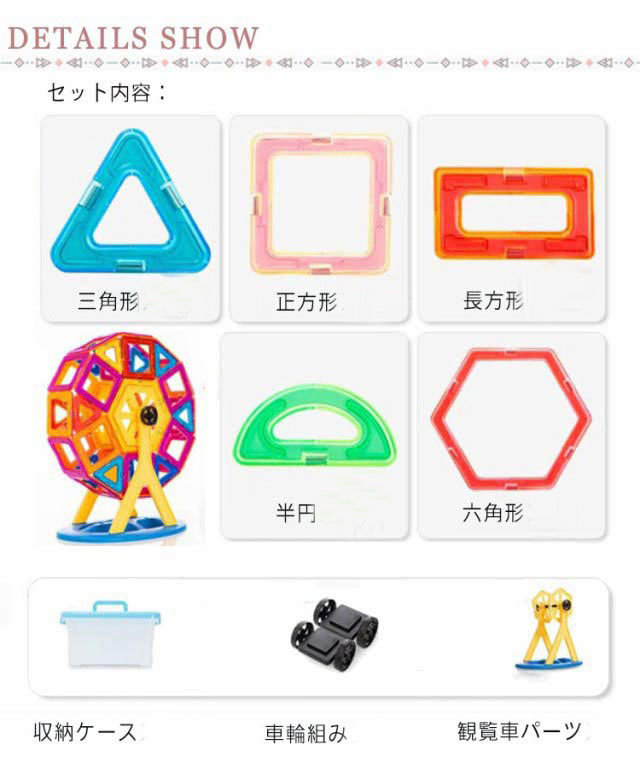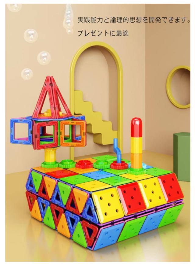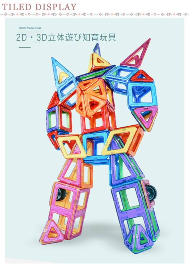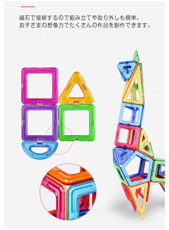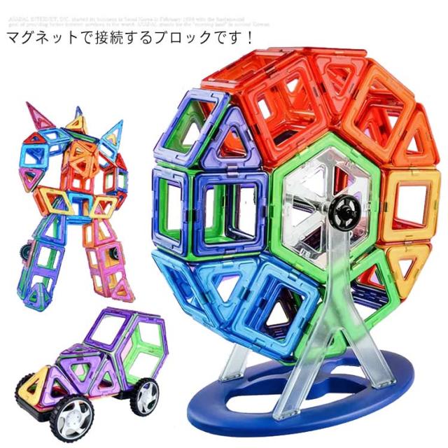 | マグネットで接続するブロックです! 作りたいカタチの図形をイメージし、それを実際にブロックで創作することによって平面図から立体物を作る感覚や想像力が養われます。 磁石で接続するので組み立てや取り外しも簡単、お子さまの想像力でたくさんの作品を創作できます。 | |