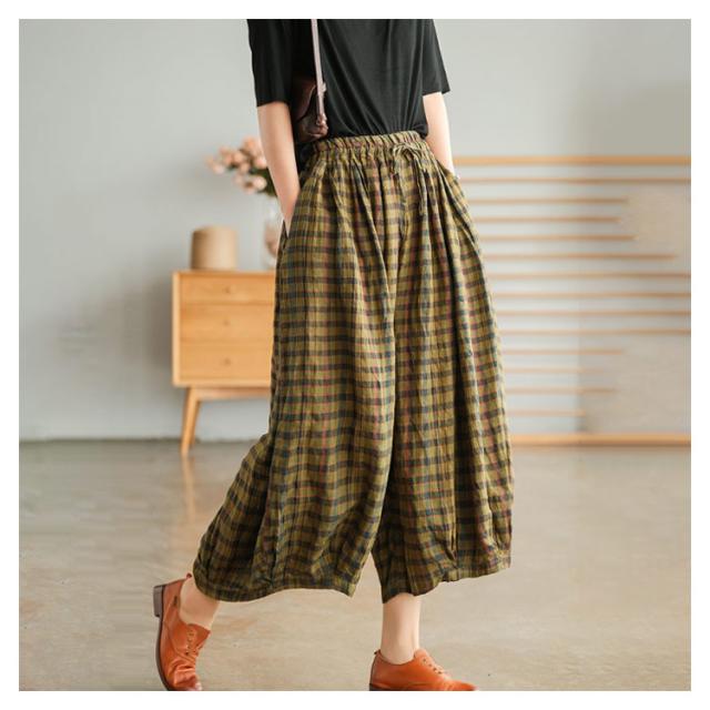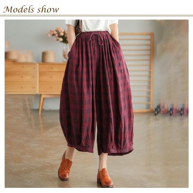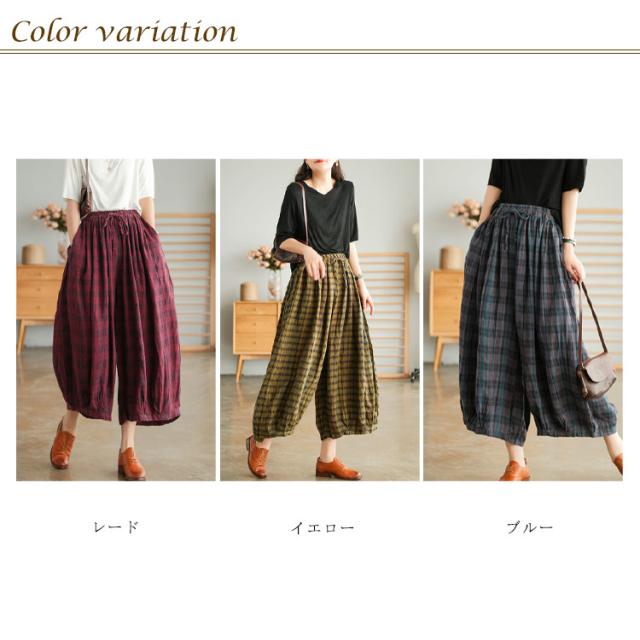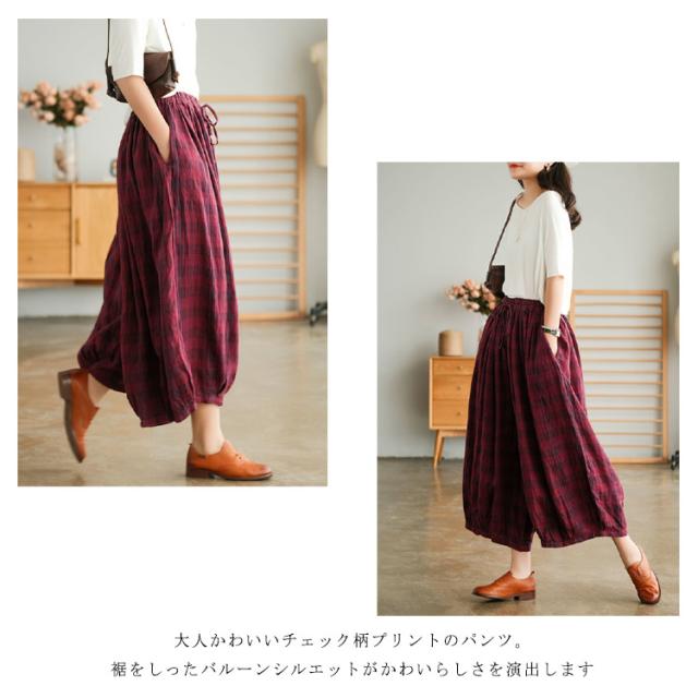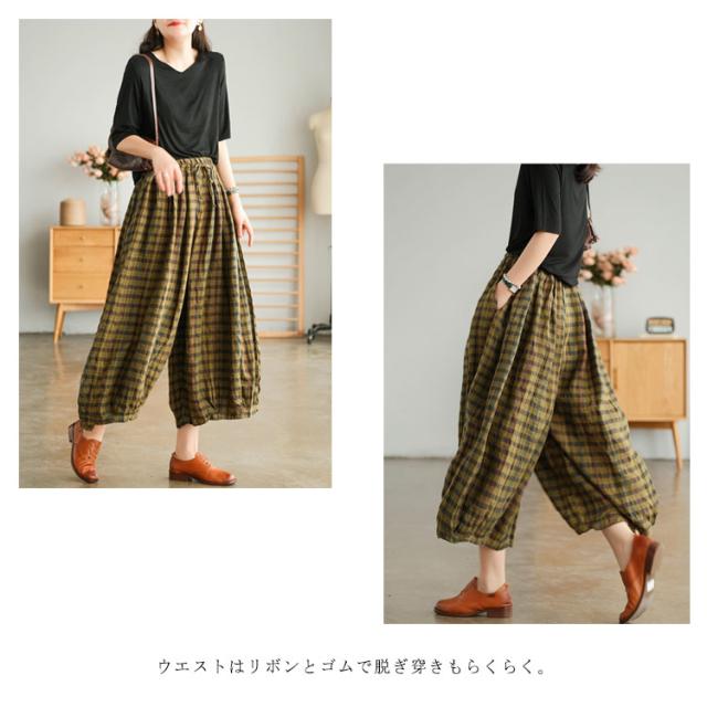リネンパンツ リネン100% ワイドパンツ レディース サルエルパンツ 9分丈 バルーンパンツ チェック柄 送料無料 ゆったり 大人カジュアル ボトムス 体型カバー ウエストゴム リラックス 着痩せ 美脚 通勤