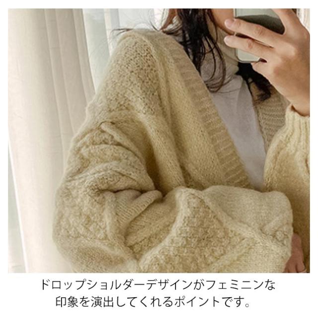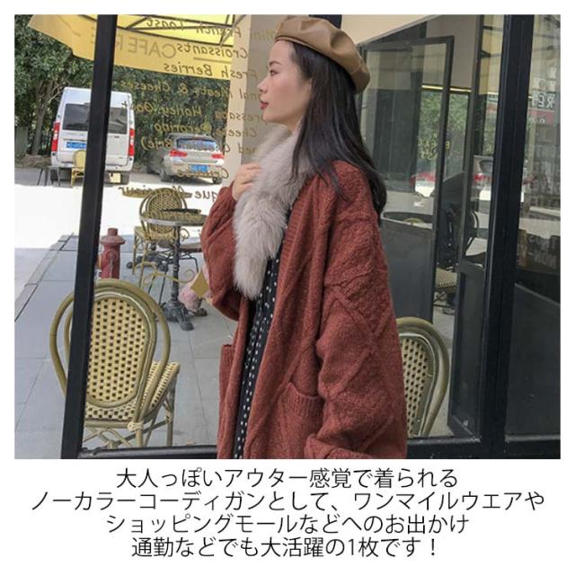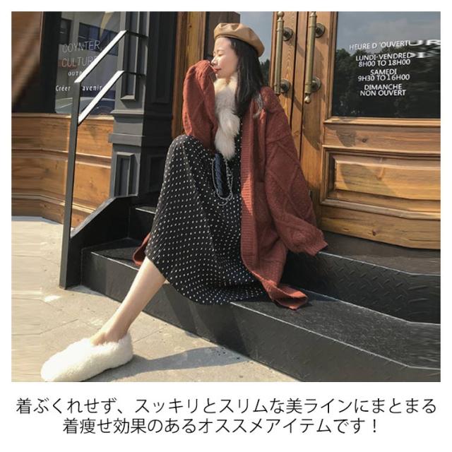 | ストンと落ちるキレイめなシルエットがシンプルなカーディガンが今年も登場しました!!ふっくらしたボリューム感が暖か&かわいいニットカーデ!ボタン無し、大きいポケット付きのデザインで、ざっくりルーズに羽織れるシルエットがトレンド感たっぷりです。ロングセーターの襟元、袖口は編み地を切り替えて立体的な質感がアクセントに!ドロップショルダーデザインがフェミニンな印象を演出してくれるポイントです。 膝位置まであるロング丈で、ヒップまわりを体型カバーしながら、暖かくなります。大人っぽいアウター感覚で着られるノーカラーコーディガンとして、ワンマイルウエアやショッピングモールなどへのお出かけ、通勤などでも大活躍の1枚です!普段のシンプルコーデにサラッと羽織れば、何気ないスタイリングながらもこなれ感を演出してくれます。これからの秋冬におすすめのニットカーデです。 フワフワなめらかな手触りのコーディガンはチクチクしない、快適な編み地に仕上げました。ガウンのような存在感がありながらも重たくなりすぎず、ふわっと肌に心地よい質感が嬉しい1枚です。着ぶくれせず、スッキリとスリムな美ラインにまとまる、着痩せ効果のあるオススメアイテムです! フリルブラウスや襟付きシャツに合わせてガーリーな着こなしも、キャミソール合わせで、ほどよい肌見せを楽しむのもオススメです。もっと寒い時にカシュクールやカットソーなどのニットトップスと合わせて保温性UP!シンプルで膝丈のゆるっと感あるデザインは、パンツにもスカートにも相性が良く、ワンピースの上にさらっと羽織るにも使いやすい着丈に仕上げているカーディガンです。 撮影環境やパソコンのディスプレイなどの影響により色が若干違って見える場合もあります。すべて平置きで測定しており、製造工程の関係上、各採寸箇所実寸(平置き)より約【-3cm- 3cm】程度は誤差の許容範囲とさせて頂いております。予めご了承ください。おうちの洗濯機で水洗いもOK!商品の風合いを長くお楽しみいただくために洗濯機を使用される場合はネットに入れ、短時間脱水、平干しがおすすめです。色移りを防ぐため、淡い色の服は他の服と分けて洗濯してください。 | |