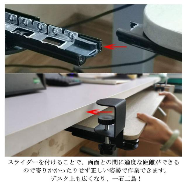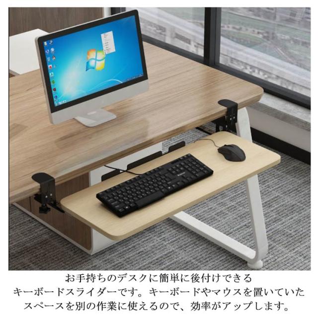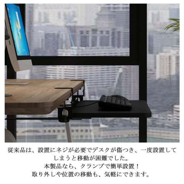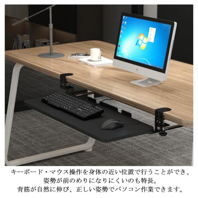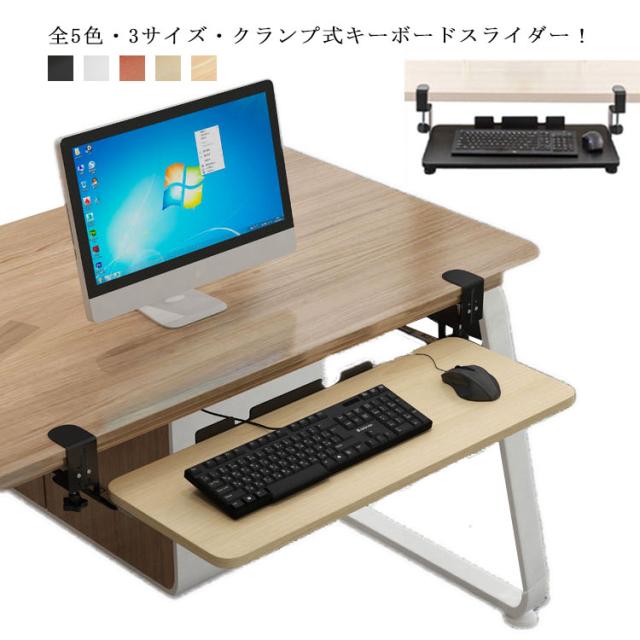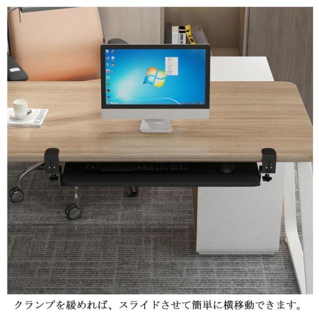| 全5色・3サイズ・クランプ式キーボードスライダー! お手持ちのデスクに簡単に後付けできるキーボードスライダーです。 キーボードやマウスを置いていたスペースを別の作業に使えるので、効率がアップします。 スライダーはゆったり設計なので、フルキーボードとマウスを載せても余裕があります。 キーボードとマウスを載せた状態でも、たわまずスムーズに出し入れできます。 タイピング操作を行っても、ぐらつきません。 従来品は、設置にネジが必要でデスクが傷つき、一度設置してしまうと移動が困難でした。 本製品なら、クランプで簡単設置! 取り外しや位置の移動も、気軽にできます。 クランプを緩めれば、スライドさせて簡単に横移動できます。 クランプには傷防止用のクッションが付いており、安心してデスクに取り付けられます。 キーボード・マウス操作を身体の近い位置で行うことができ、姿勢が前のめりになりにくいのも特長。 背筋が自然に伸び、正しい姿勢でパソコン作業できます。 スライダーを付けることで、画面との間に適度な距離ができるので寄りかかったりせず正しい姿勢で作業できます。 デスク上も広くなり、一石二鳥! | |