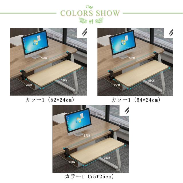 | サイズについての説明 | サイズ:52*24*1.2cm 65*24*1.2cm 75*25*1.2cm 机厚さ:1−8cm適用 ※サイズ表の実寸法は商品によって0.5-2cm程度の誤差がある場合がございます。モニターの発色具合により、実際の物と色が異なる場合があります。取り付けの際は、引き出しなど干渉物がないことをご確認ください。 |