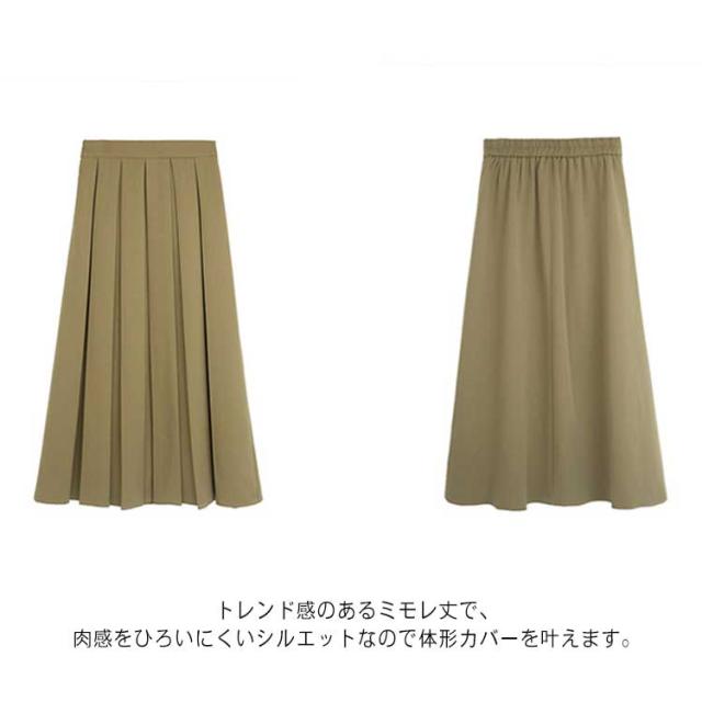 | 履くだけで雰囲気を醸し出してくれるプリーツスカートが新登場。 柔らかなフレアのドレープ感が、大人のレディースの魅力を引き立ててくれます。 ウエスト部分はゴム仕様でお腹回りを締め付けず、ストレスフリーで着ていただけます。 トレンド感のあるミモレ丈で、肉感をひろいにくいシルエットなので体形カバーを叶えます。 トップスと合わせて、様々なコーデで活躍が期待できる優れモノです。 | |