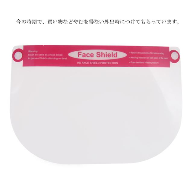 | 子ども用かわいい透明のフェイスシールド発売中。 花粉やウイルスなどの飛沫対策に役立ちます。 今の時期で、買い物などやむを得ない外出時につけてもらっています。 暑い時期のマスク代わりにもおすすめ。 お得な5枚セットで、ぜひお試しください! | |