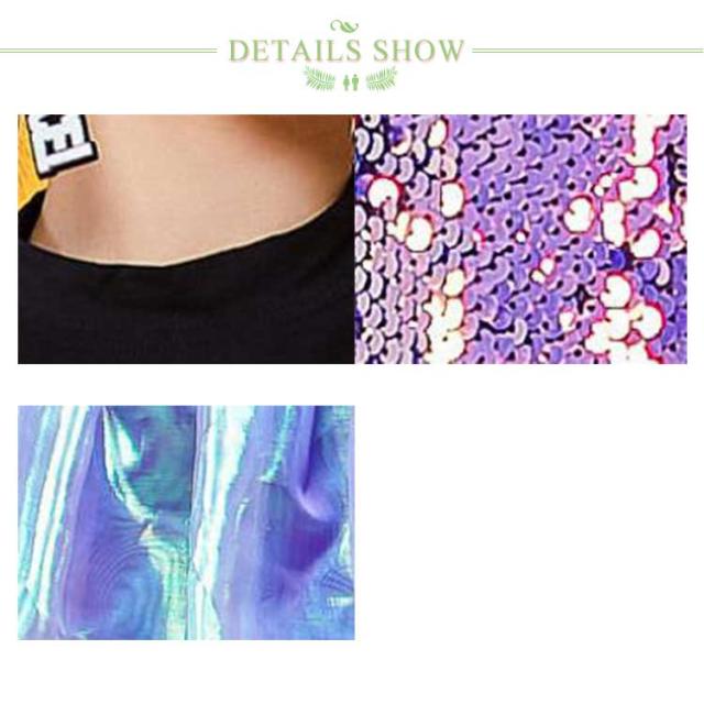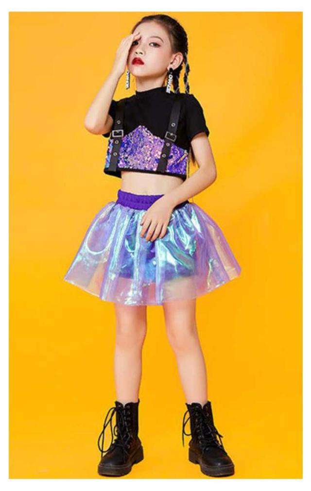 | キラキラ光るスパンコール!舞台効果をアップされます! ベルトをした半袖Tシャツ、チュール素材カバーのスカート。 かわいくて綺麗なデザインで団体演出服として最適なアイテムです。 | |