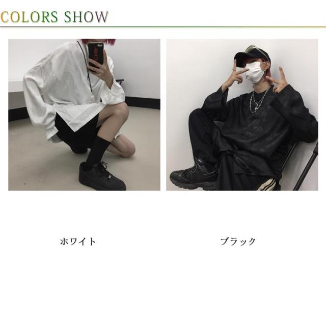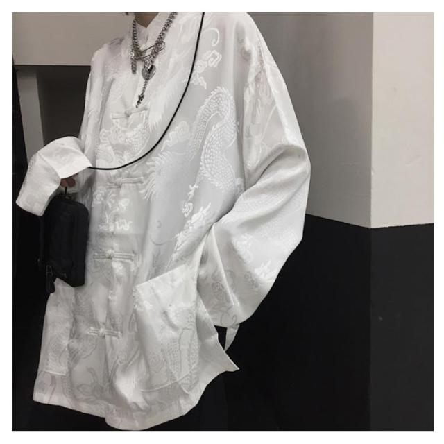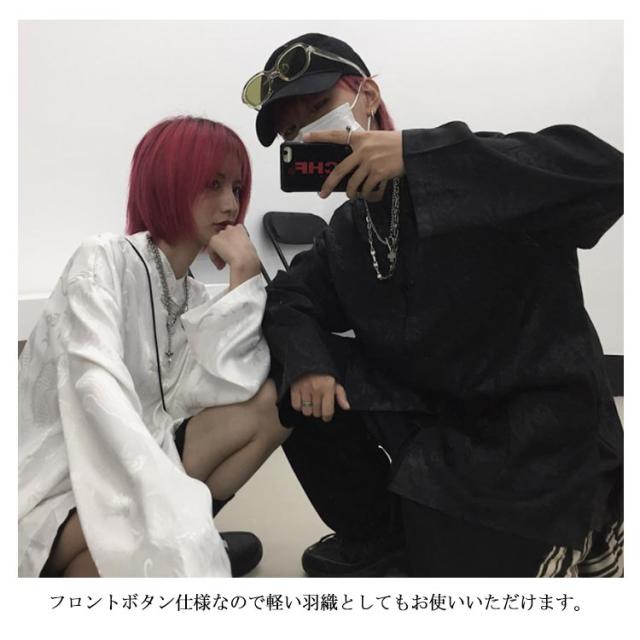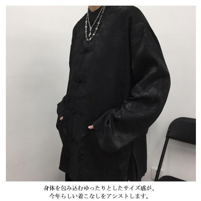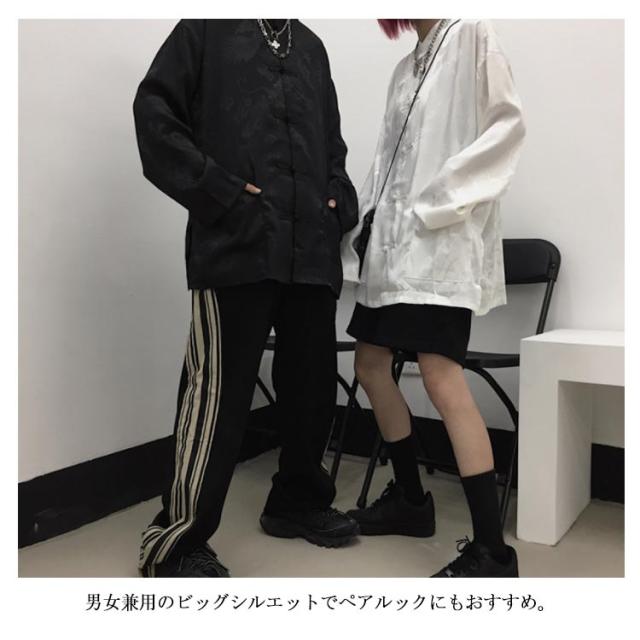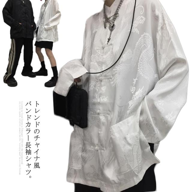【送料無料】チャイナ風シャツ ブラウス レディース メンズ ユニセックス トップス シャツブラウス ドラゴン プリント 和風 無地 バンドカラー スタンドカラー 長袖 羽織り ゆったり チャイナブラウス チャイナボタン オーバーサイズ カジュアル モノトーン 原宿系