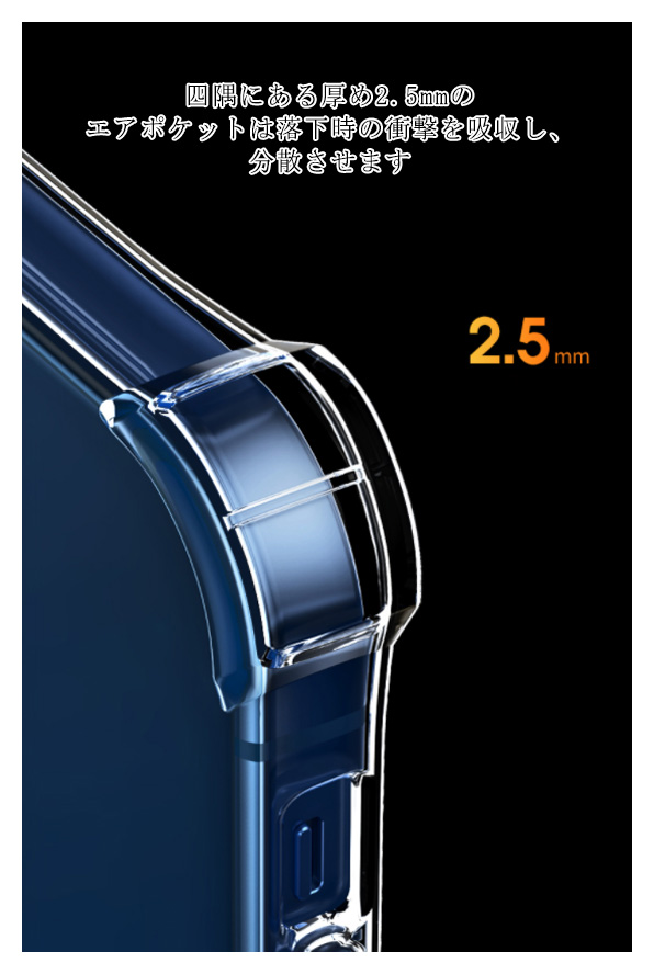 | iPhone本来の美しさを保つことができる透明なケースです。 四隅にある厚め2.5mmのエアポケットは落下時の衝撃を吸収し、分散させます。 弾力性があり、耐黄変性に優れてiPhoneにピッタリとフィットする。 柔らかいTPUの一体成型により、耐衝撃性と持ちやすさを実現。 極上の透明感、スリムで軽く、まるで本体のような手触りです。 | |