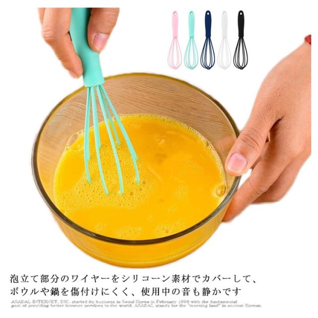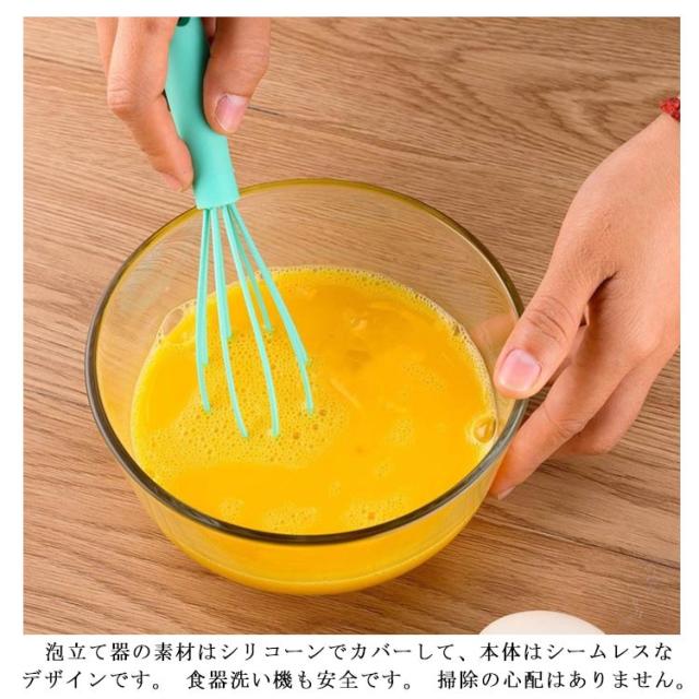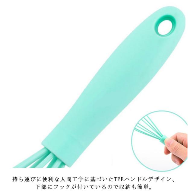 | 泡立て部分のワイヤーをシリコーン素材でカバーして、ボウルや鍋を傷付けにくく、使用中の音も静かです 泡立て器の素材はシリコーンでカバーして、本体はシームレスなデザインです。 食器洗い機も安全です。 掃除の心配はありません。 持ち運びに便利な人間工学に基づいたTPEハンドルデザイン、下部にフックが付いているので収納も簡単。 | |