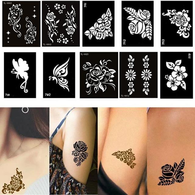 顔や手や足、背中やお腹、胸やおへそ、足首や太腿などいろいろな場所にフェイクタトゥーを簡単に描けるヘナタトゥー用のステンシルシートステッカーです。