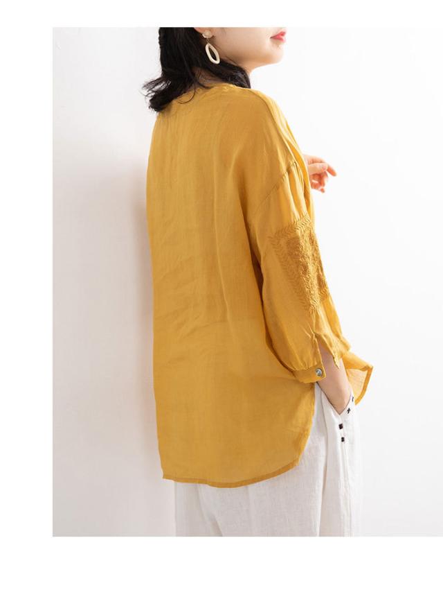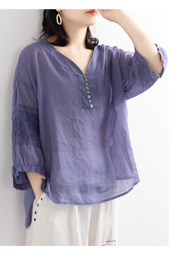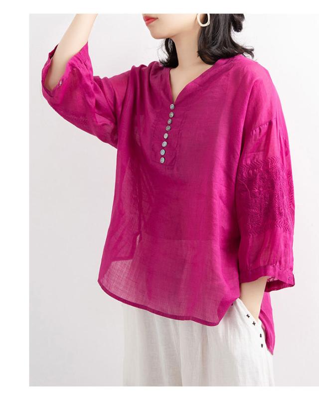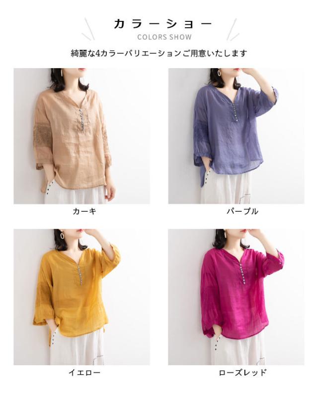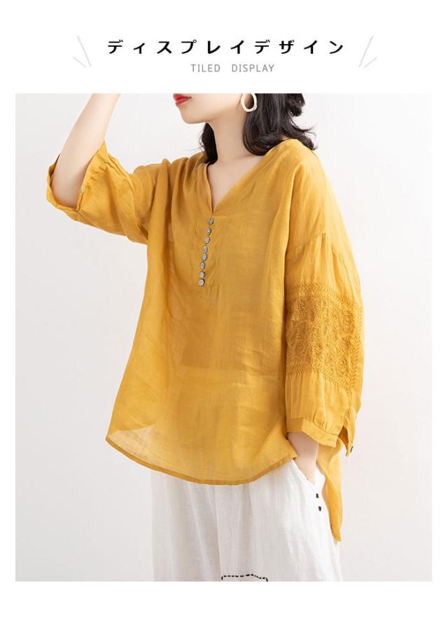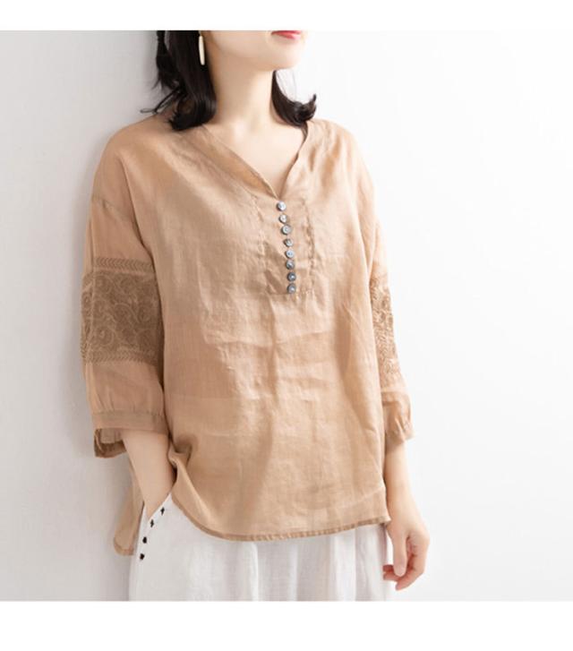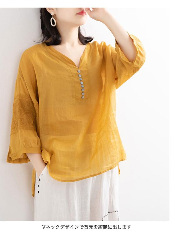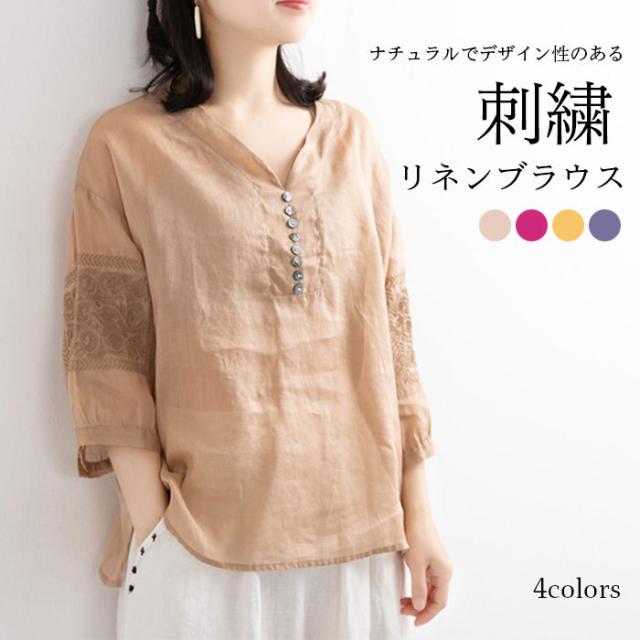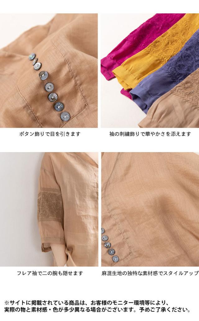 リネンブラウス リネン ブラウス 刺繍 レディース 綿 麻 麻生地 コットン混 リネン混 五分袖ブラウス Vネック ナチュラル トップス 春新作