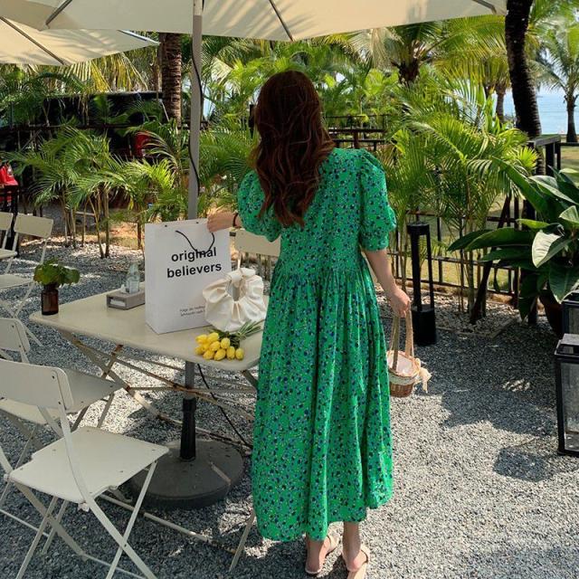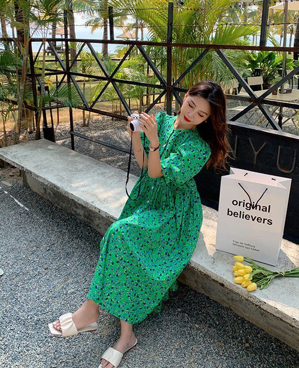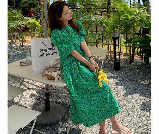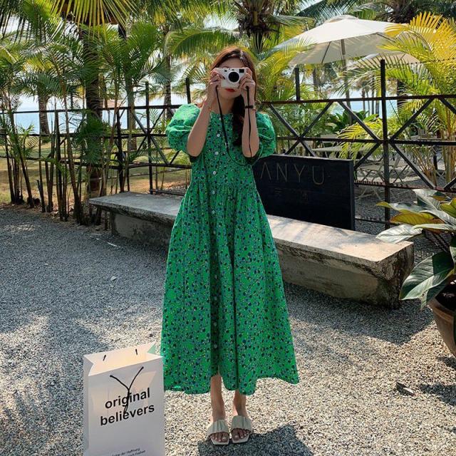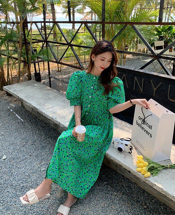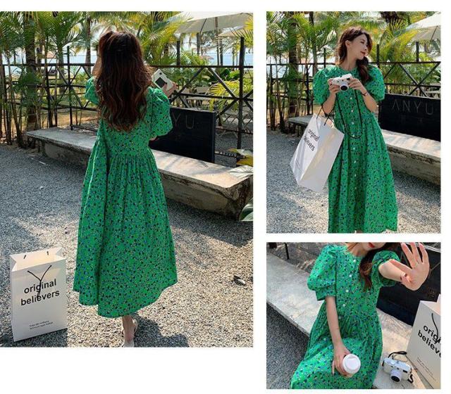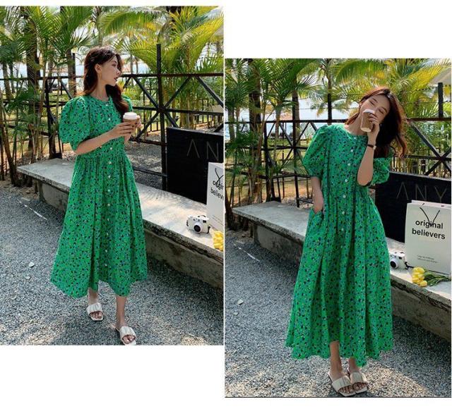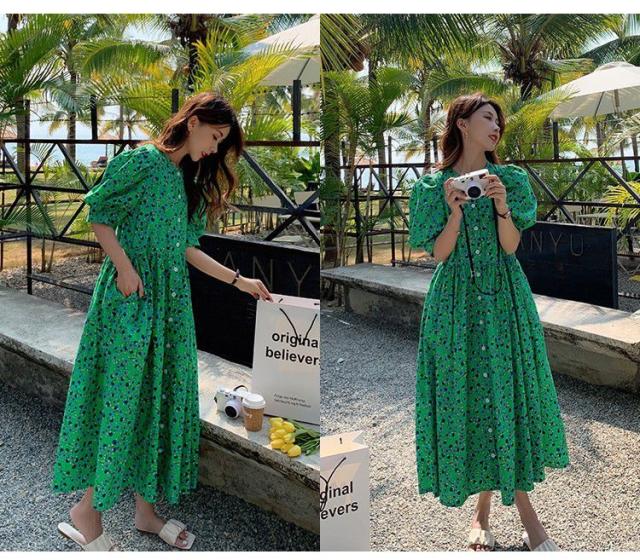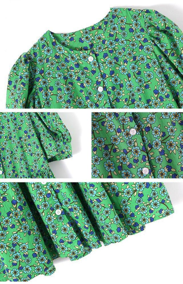 ワンピース 5分袖 ウエストギャザー 総柄プリント ロング丈ワンピ ボタン クラシカル ふんわり 女子旅 お出かけファッション きれいめ /[pix47]