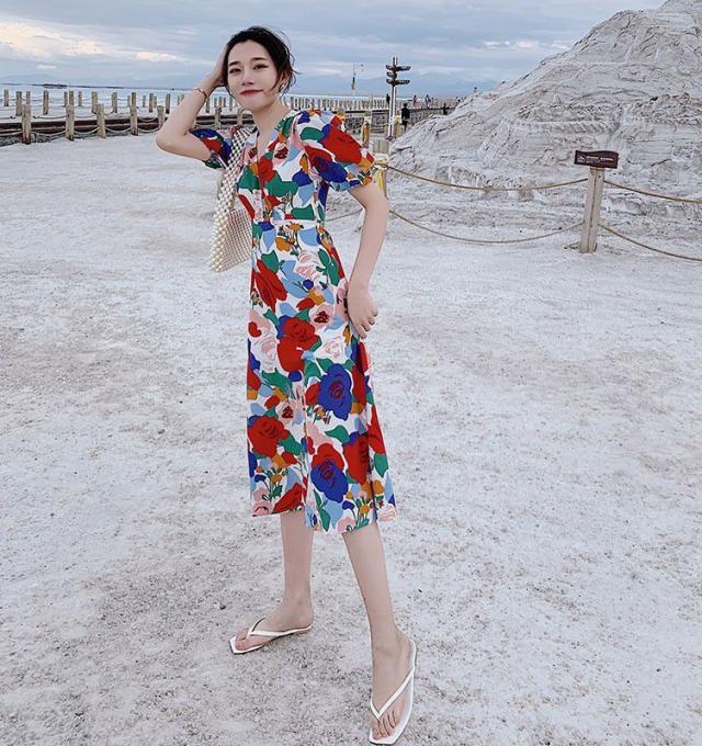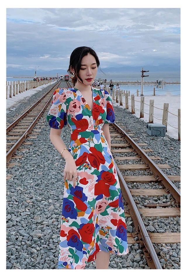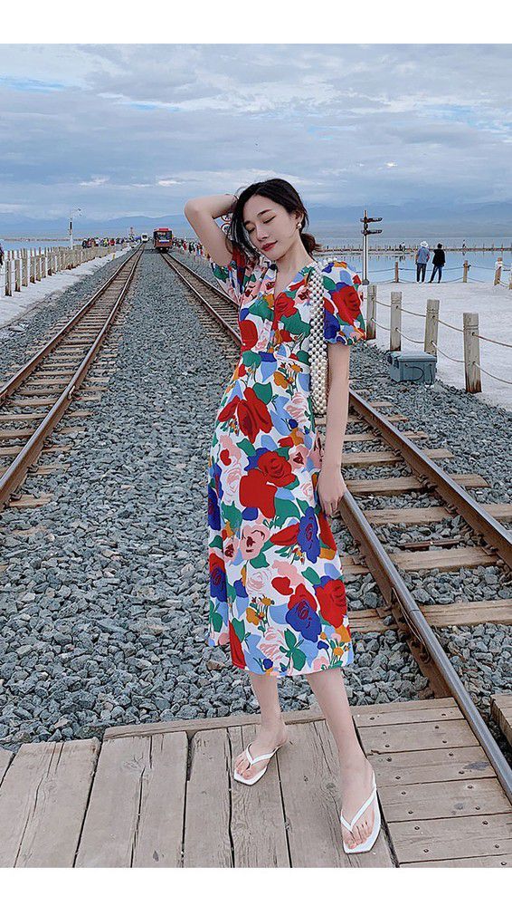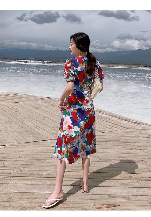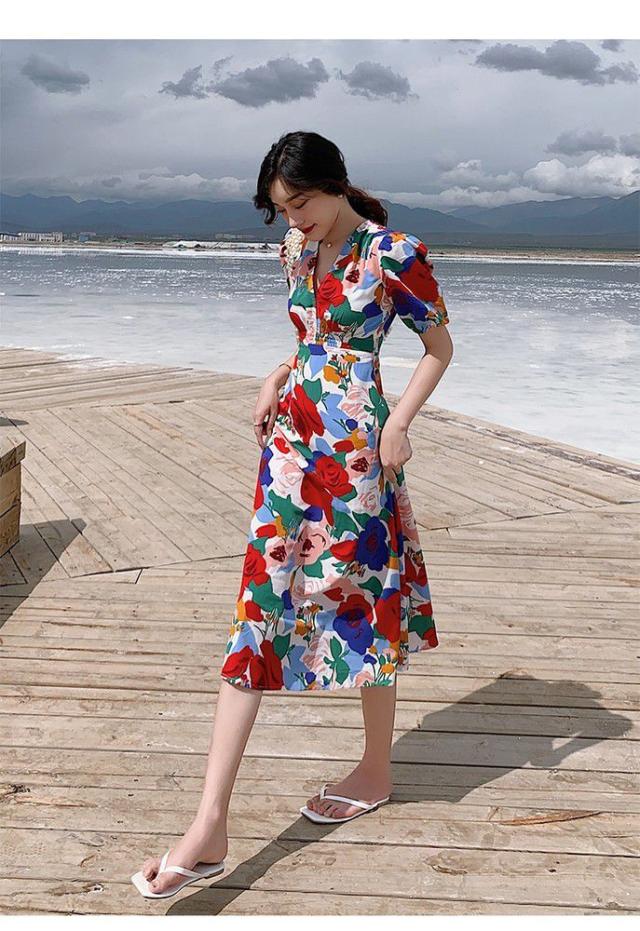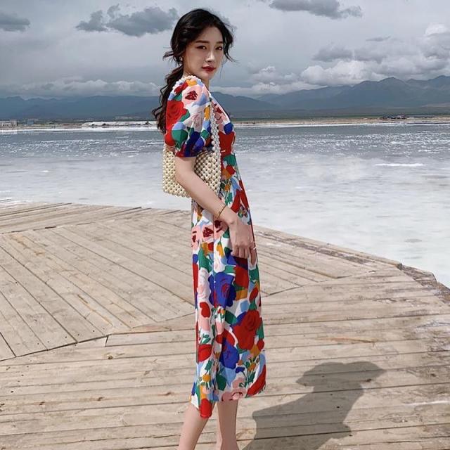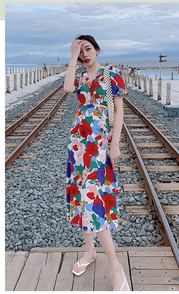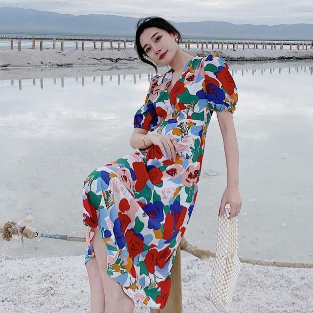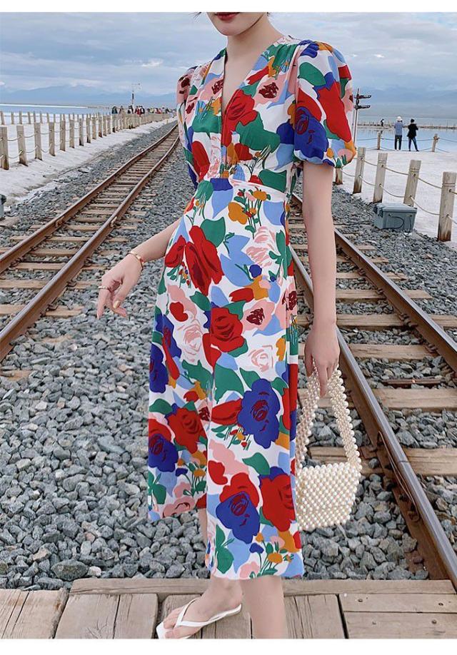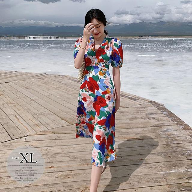 ワンピース パフスリーブ 花柄 Vネック 総柄 Aライン ウエストシェイプ 薔薇 ロングワンピース ロング丈 カラフル クラシカル 涼しげ 半袖 /[pix68]