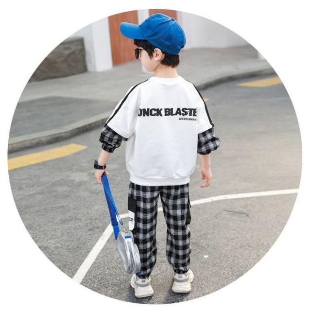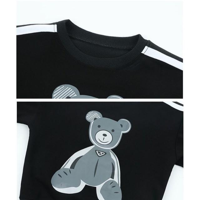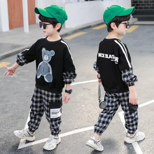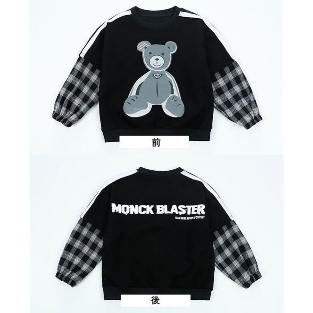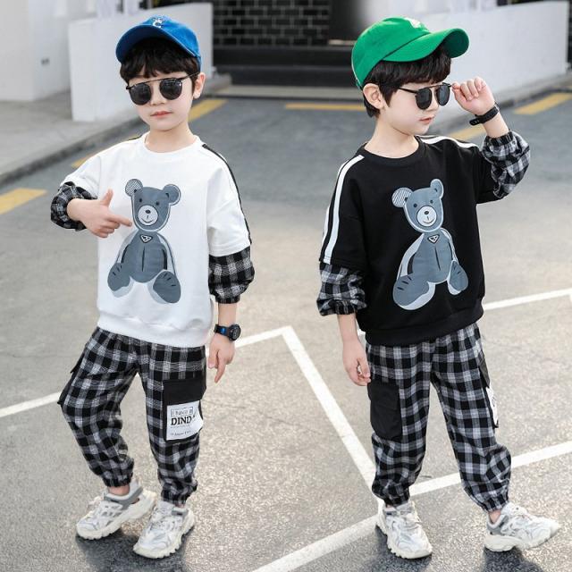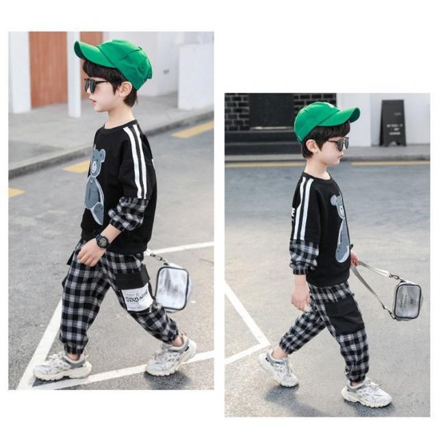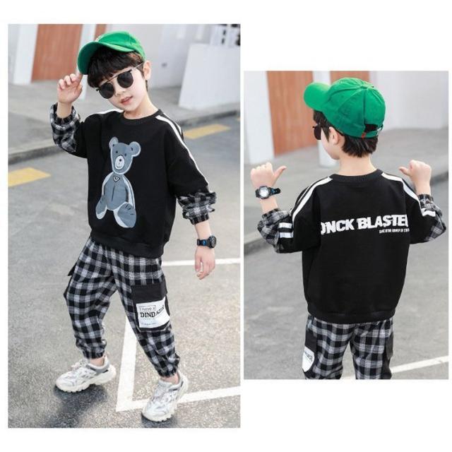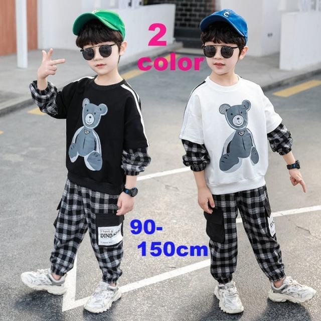 セットアップ 子供服 キッズ ベビー ジュニア 男の子 女の子 上下 2点セット 長袖 ロングパンツ 重ね着風 チェック クマ カジュアル 英字ロゴ