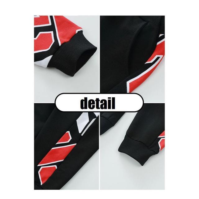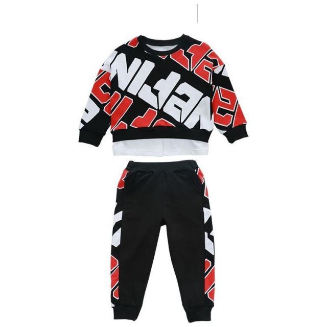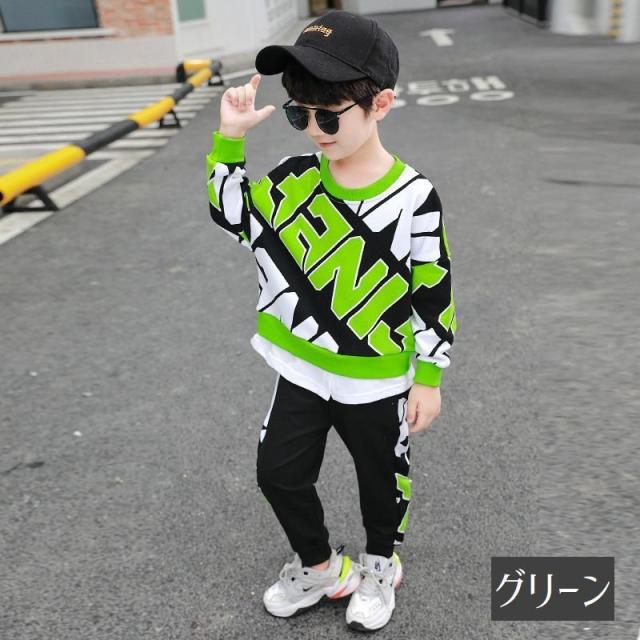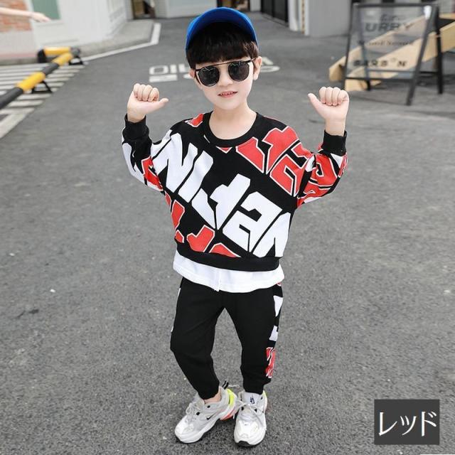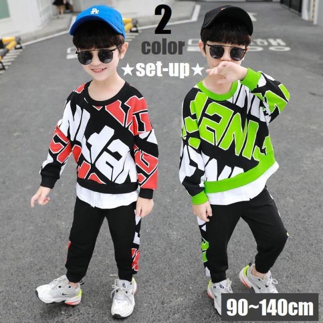 セットアップ 上下セット キッズ 子供用 男の子 女の子 スウェット トレーナー 長袖 長ズボン 英字ロゴ 重ね着風 レイヤード風 袖リブ ポケット付
