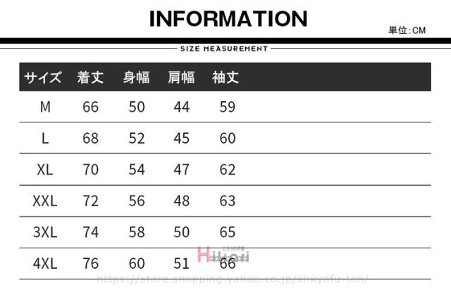 | サイズについての説明 | サイズ M L XL 2XL 3XL 4XL※お使いの画面と実際のお色に若干の差がある場合がございます。 |