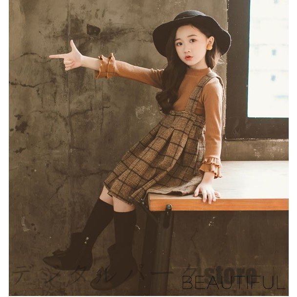 子供服 秋冬ワンピース 長袖 セットアップ キッズ 無地 Tシャツ カシュクール+チェック柄ワンピース 女の子 可愛い 女児 暖かい