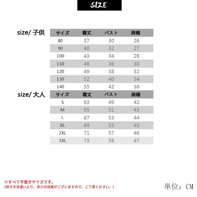 | サイズ | 子供 80 子供 90 子供 100 子供 110 子供 120 子供 130 子供 140 大人 S 大人 M 大人 L 大人 XL 大人 2XL 大人 3XL |